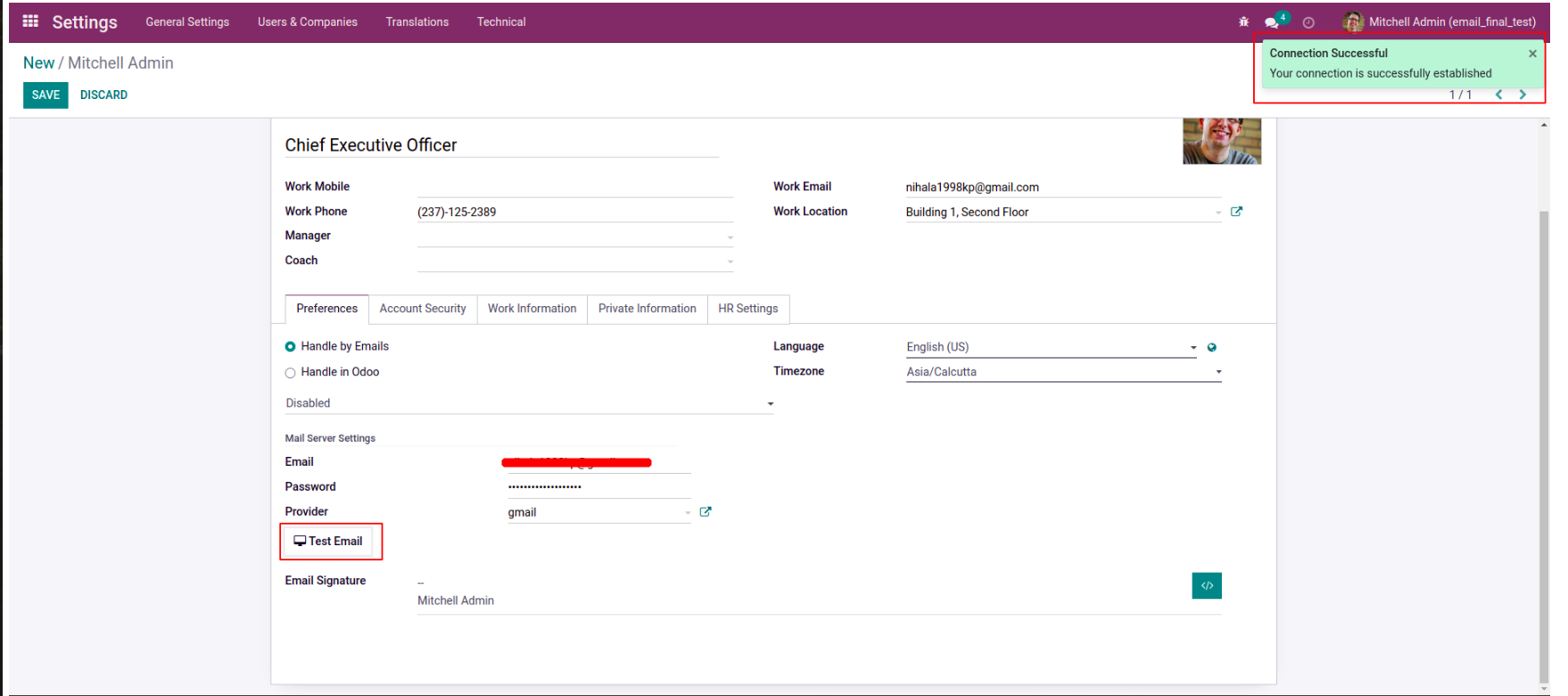 Upon clicking the Test Email button, a successful connection will be indicated by a sticky note.