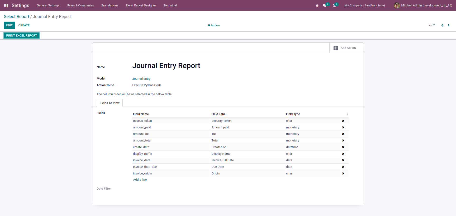 The reports can be configured and printed using the 'Excel Report Designer' menu at Settings. Select the desired model on which you want to create report, select the required fields and filter using any of the date field in the model.