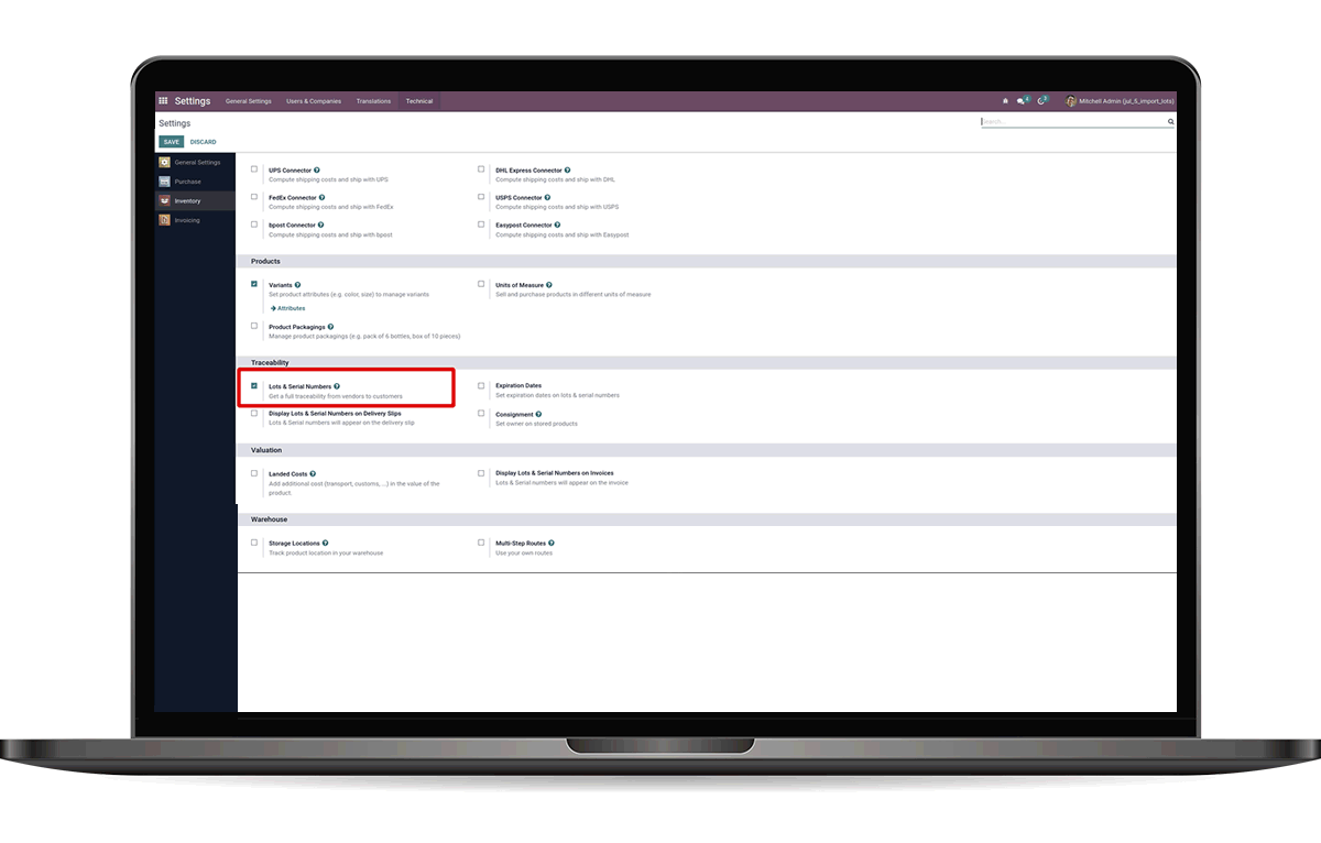 Enable lots option under inventory from res_config_settings.