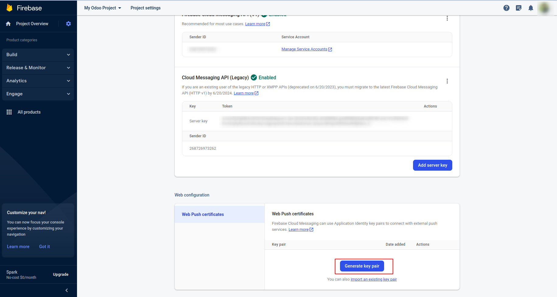 You can create the server key we need in odoo.For that goto the Cloud Messaging --> Cloud Messaging API (Legacy) --> 3 dots -->Manage API in Google Cloud Console --> Enable the Cloud Messaging