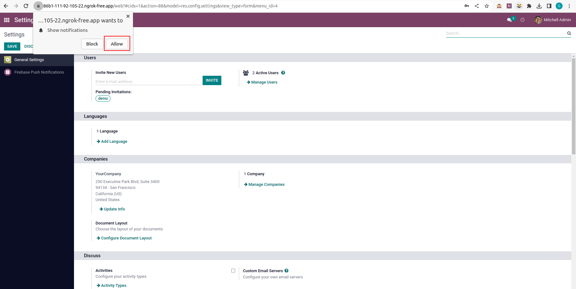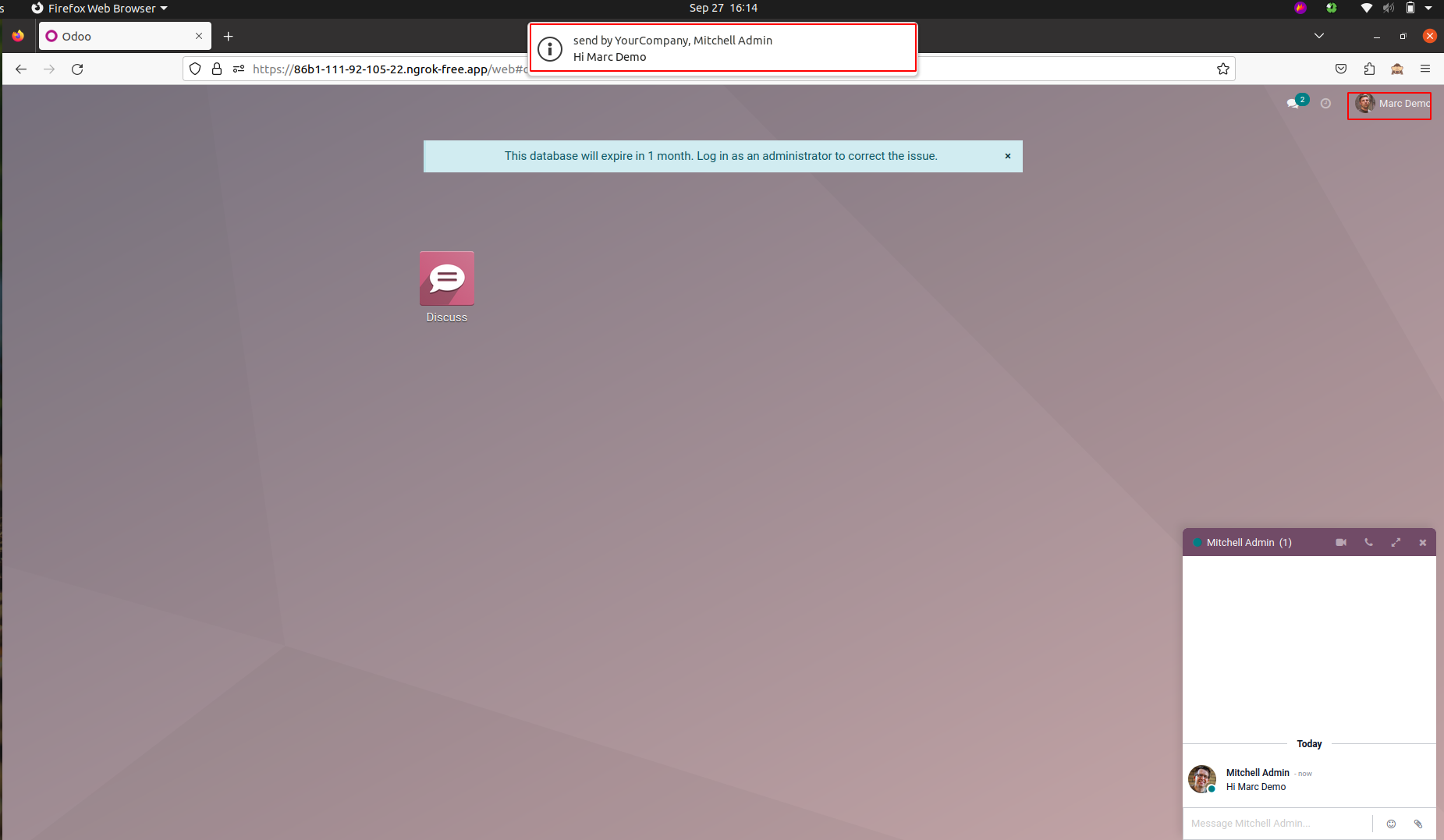 Then you can see a popup notification in the other user and when you click on that it will be redirected to the odoo instance