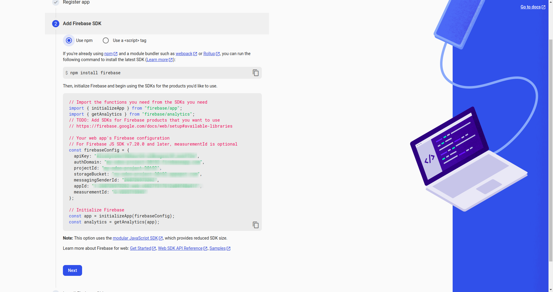 Here you can see all the details we need you can copy them and after that select npm and click the Next Button