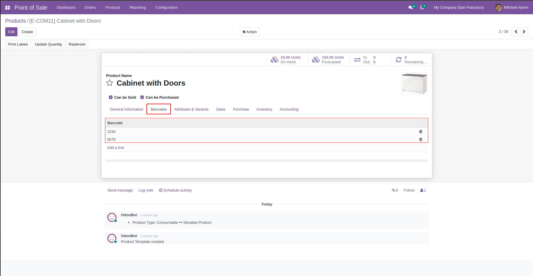 Scan the barcode using the barcode scanner and you can see the product gets added in ordeline. If there is only single product Variant, you can see the multiple barcodes set for product in Point of sale -- > Products --> Products