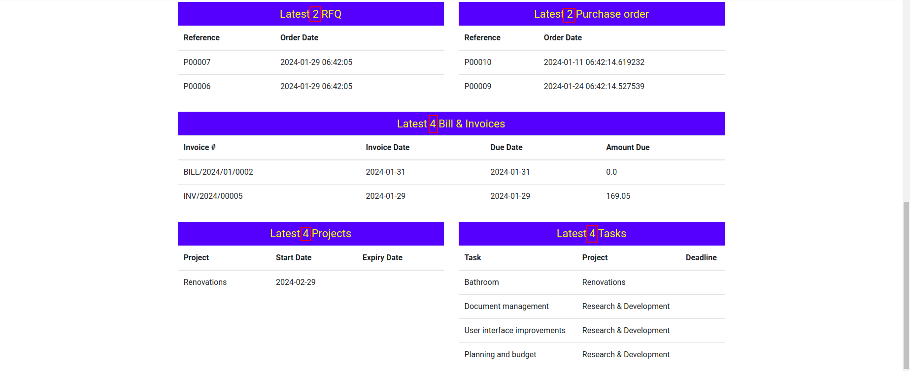 Allows to view table view of sale order, quotations, purchase orders, RFQ s, invoices, bills, projects and tasks