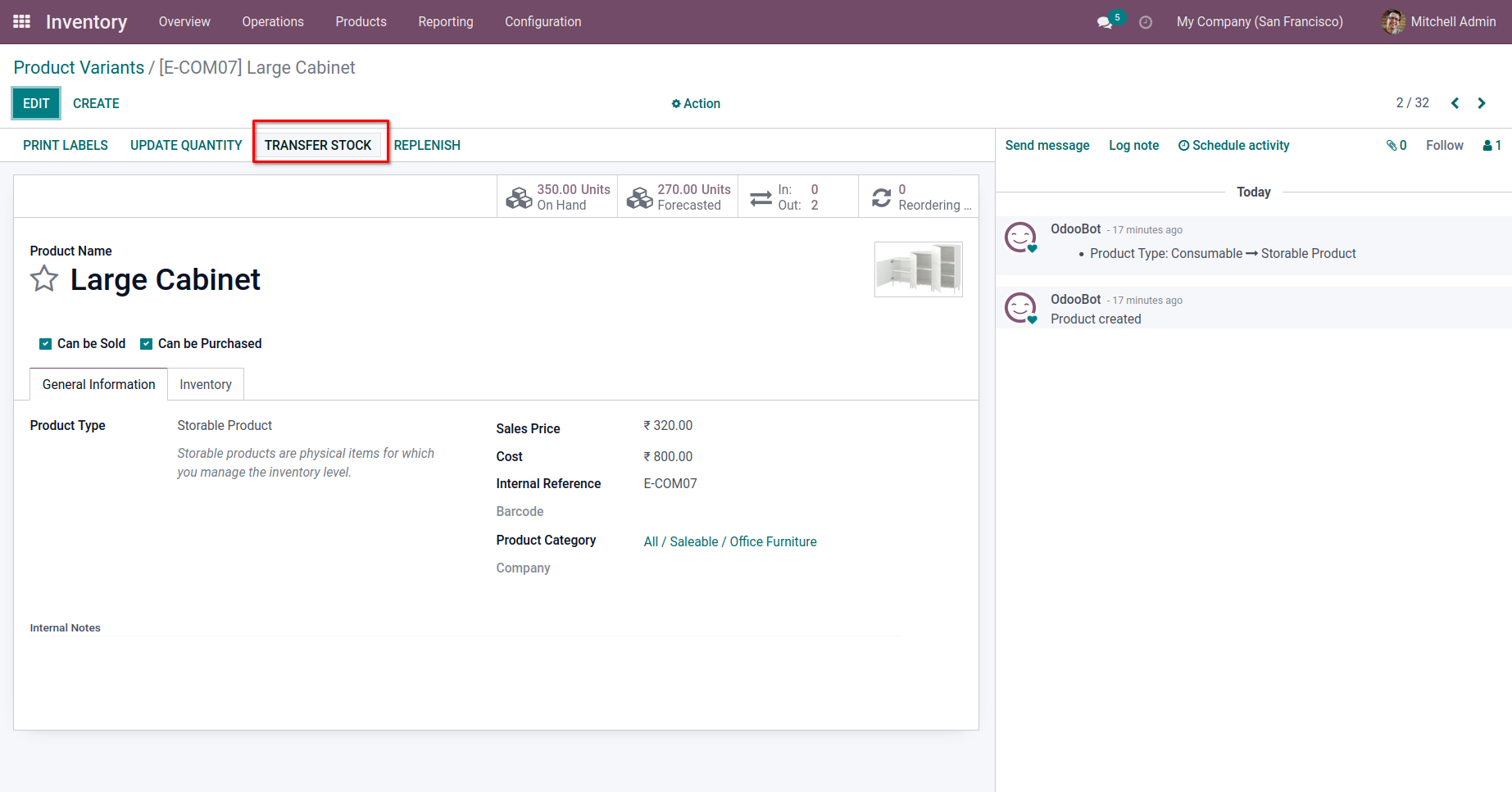 Click on Apply button ,a stock transfer for that product occur from source location to destination location with quantity