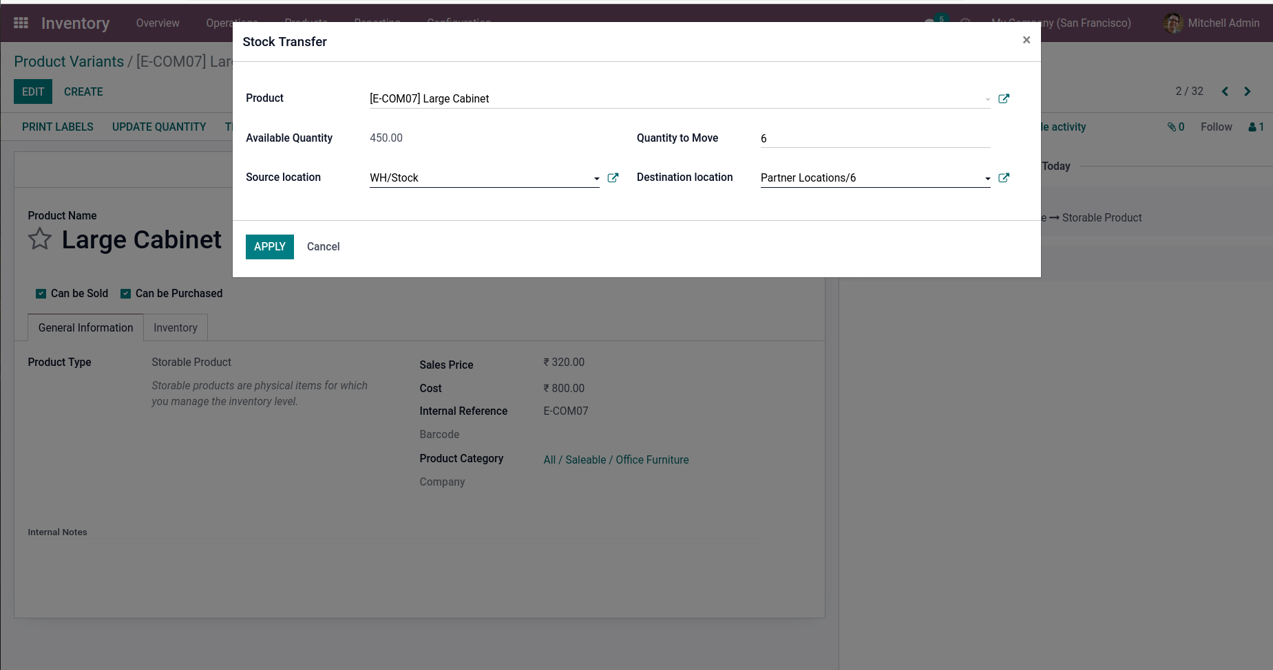 Select source location, destination location and enter quantity to transfer and Click on apply.