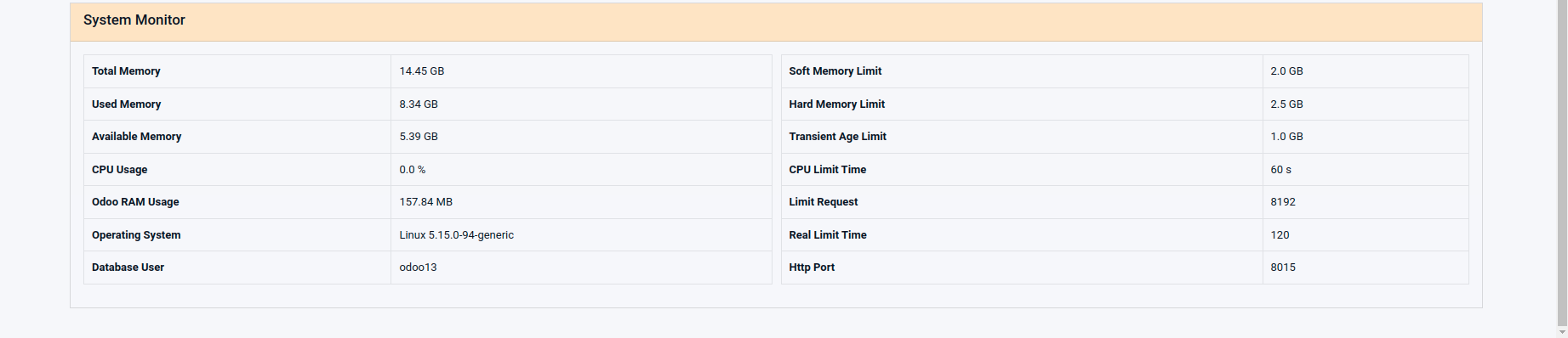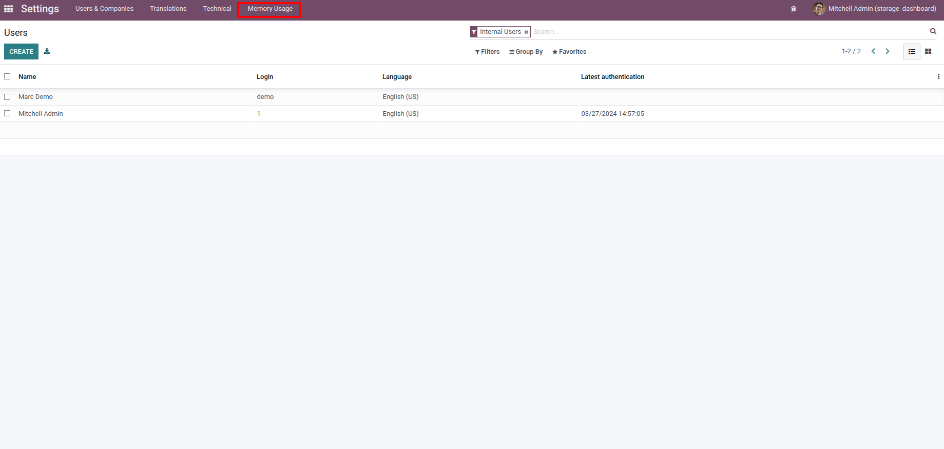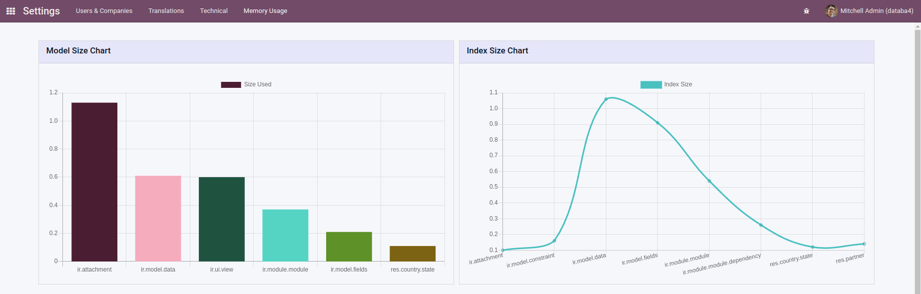 Odoo Storage Dashboard Provides Memory Usage Statistics for Various Models in the Current Database
