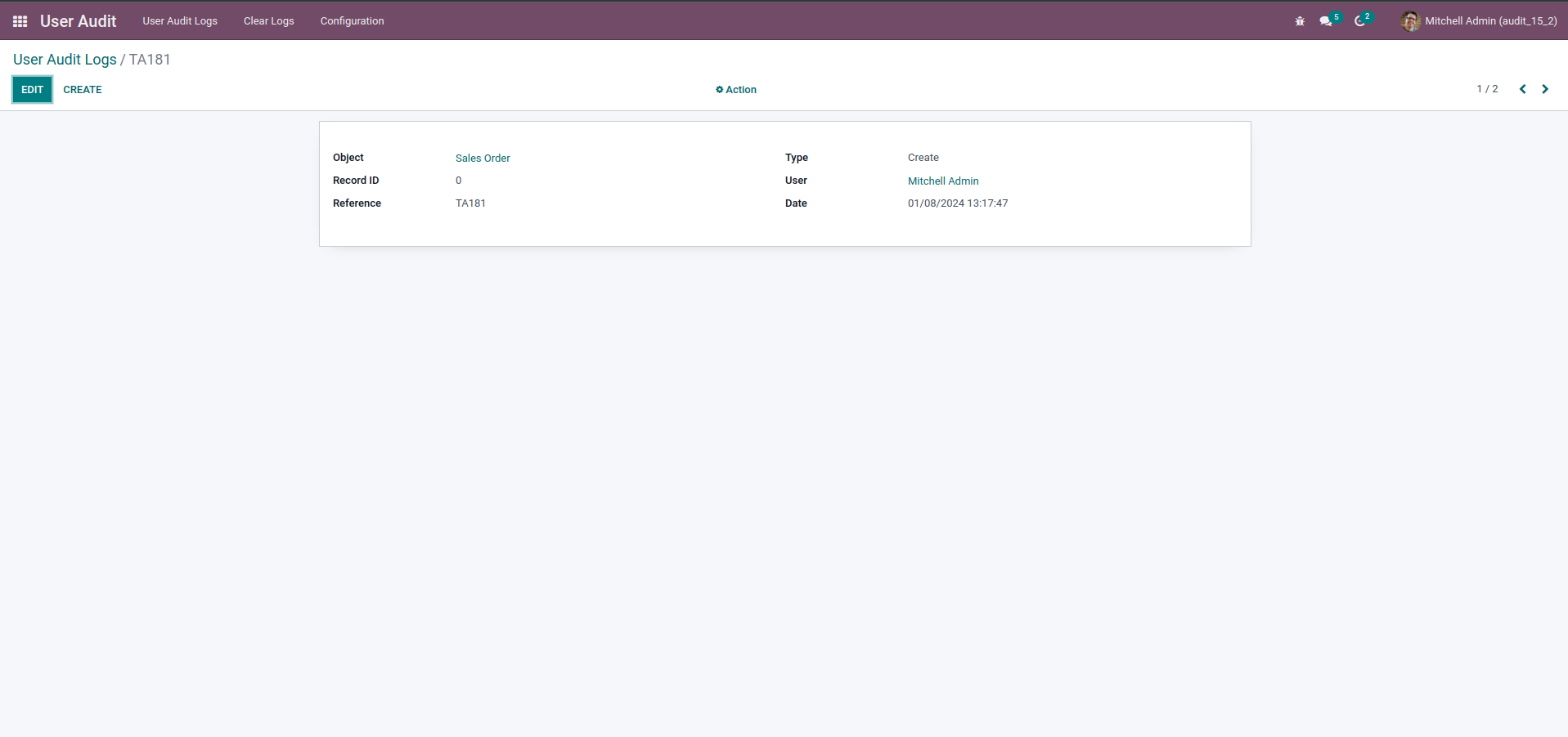 User Audit -> User Audit Logs we can see one record has been created based on the creation activity.