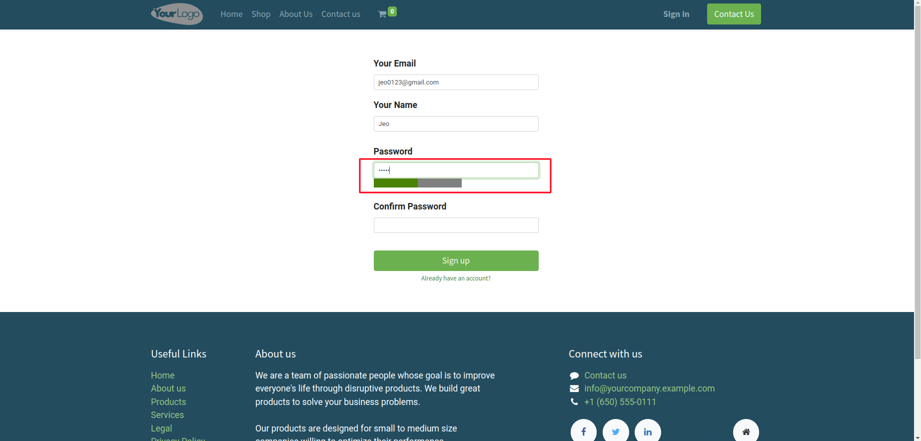 This module helps to show user password strength by checking if the password is a combination of alphanumeric characters along with special characters and shows percentage of the strength of the password and complexity of the password with the help of few conditions. Conditions for a strong password are: - Should have 8 characters. - Should have at least one number. - Should have at least one uppercase and one lowercase character. - Should have at least one special symbol.