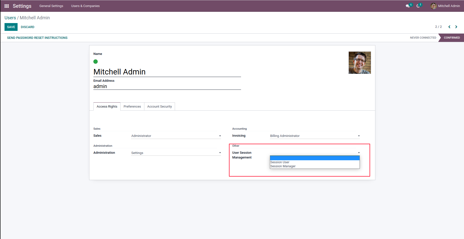 "Session user" has access to own documents only. "Session Manager" has access to all documents.