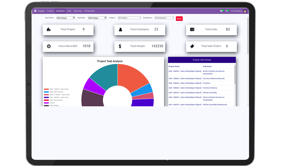 Project Dashboard has different types of Graphs that will give you a complete analyzing of the Project module.