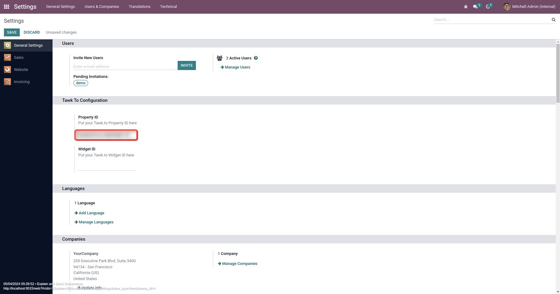 Add the Widget ID to Odoo Settings and click on the "SAVE" button.