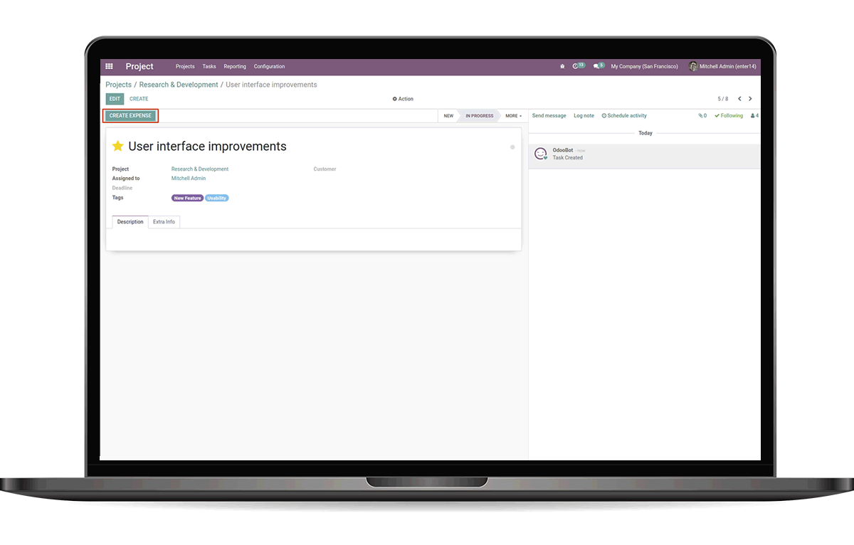 Assigned users can request expenses related to their task by clicking a "Create Expense" button in the task form and filling out a form with the item or service they need to purchase and the requested amount.