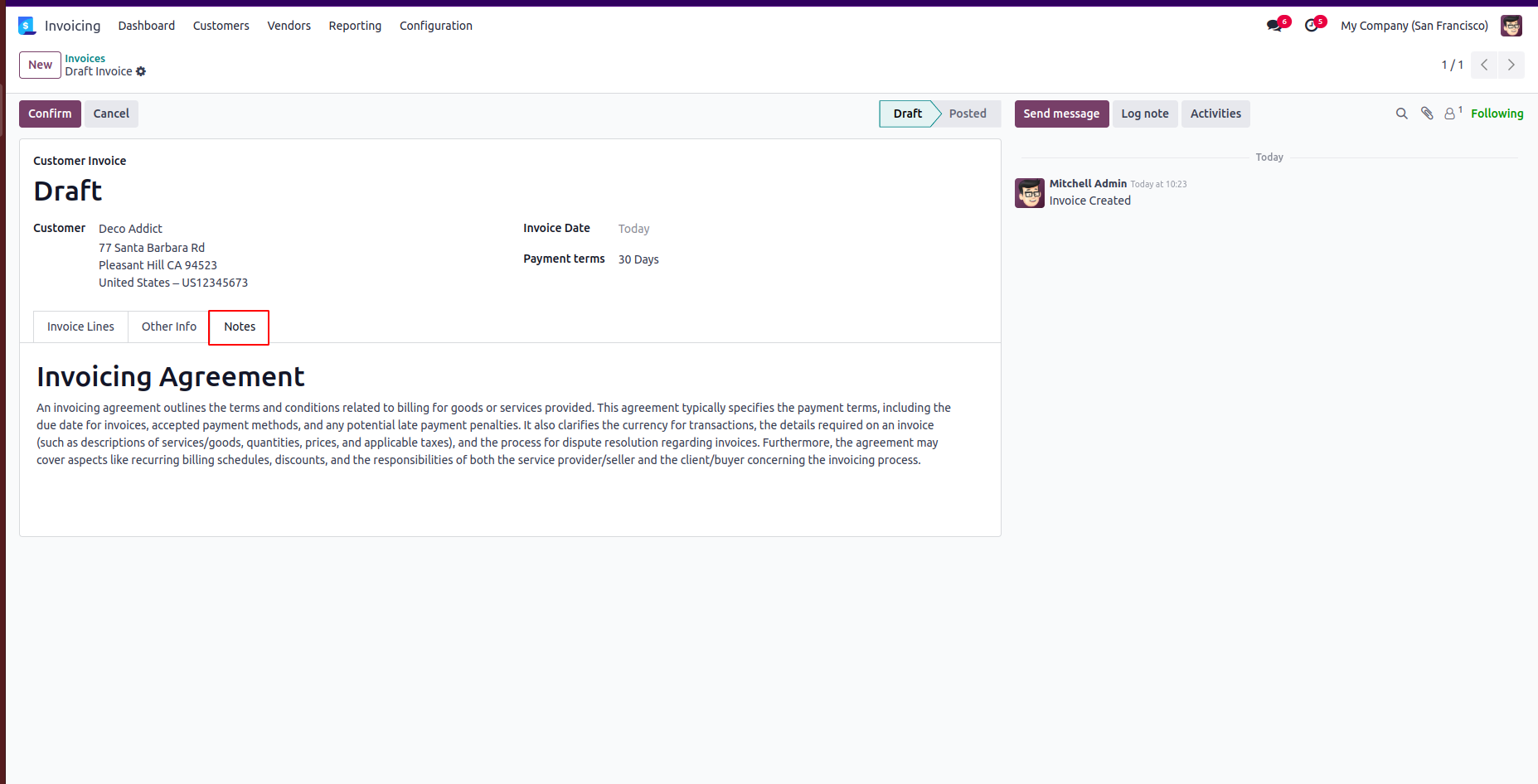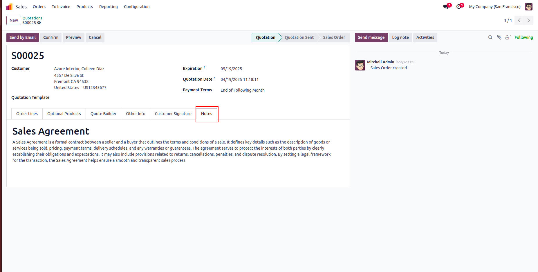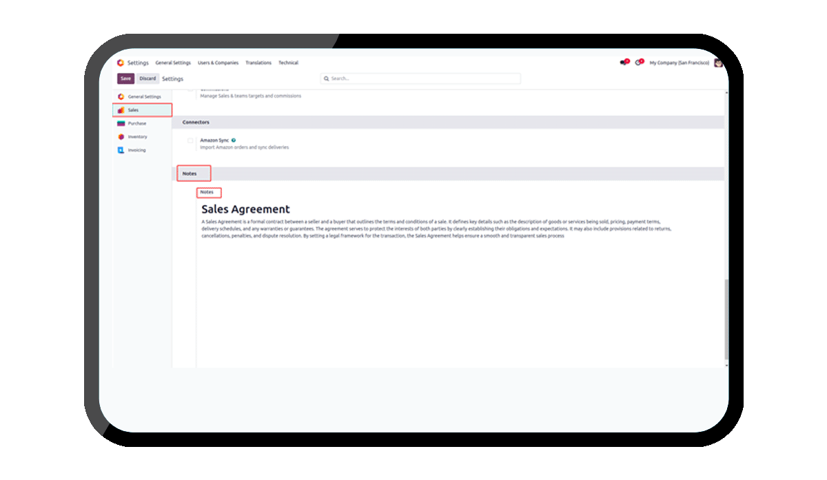 It has rich-text HTML note fields to key Odoo documents such as Sale Orders, Purchase Orders, Customer Invoices, and Inventory Transfers. Users can insert and manage detailed notes with formatting.