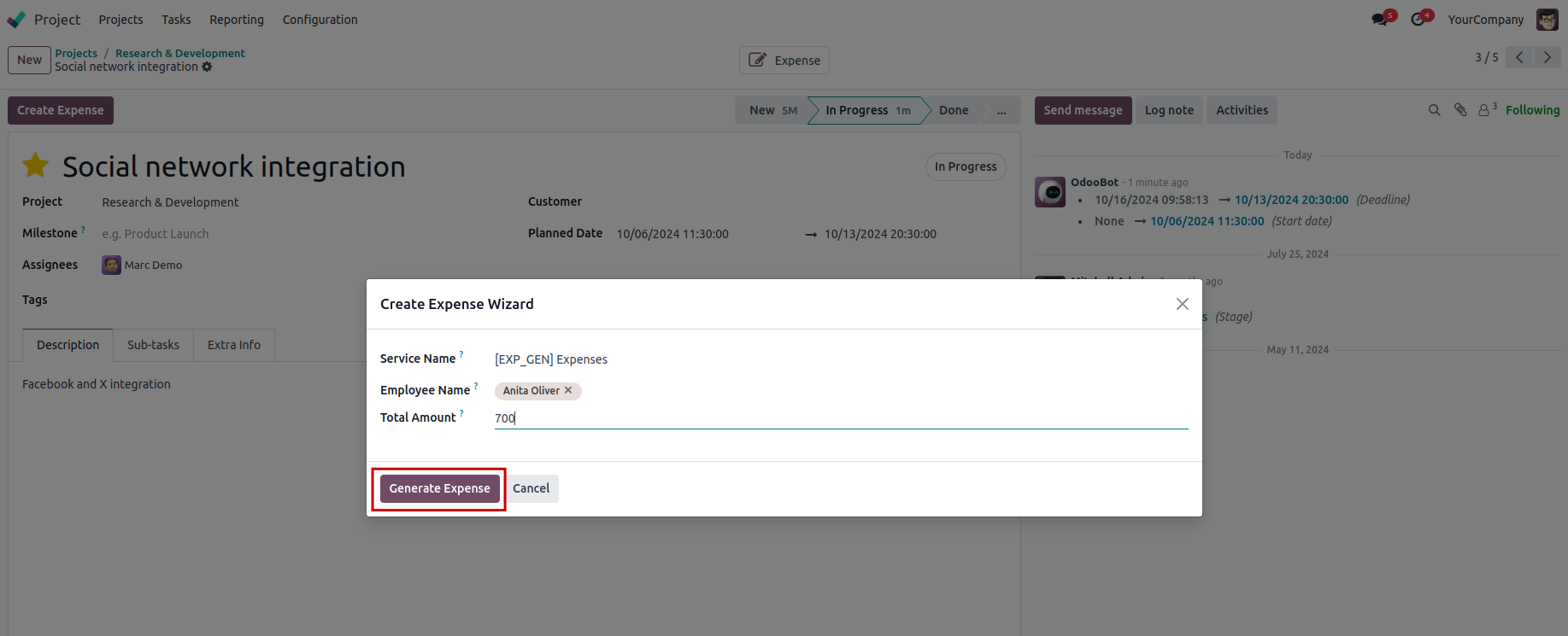 After installation, open the project task from which you want to create an expense. You will find an option to create expenses within the task view. Fill in the necessary details and save.