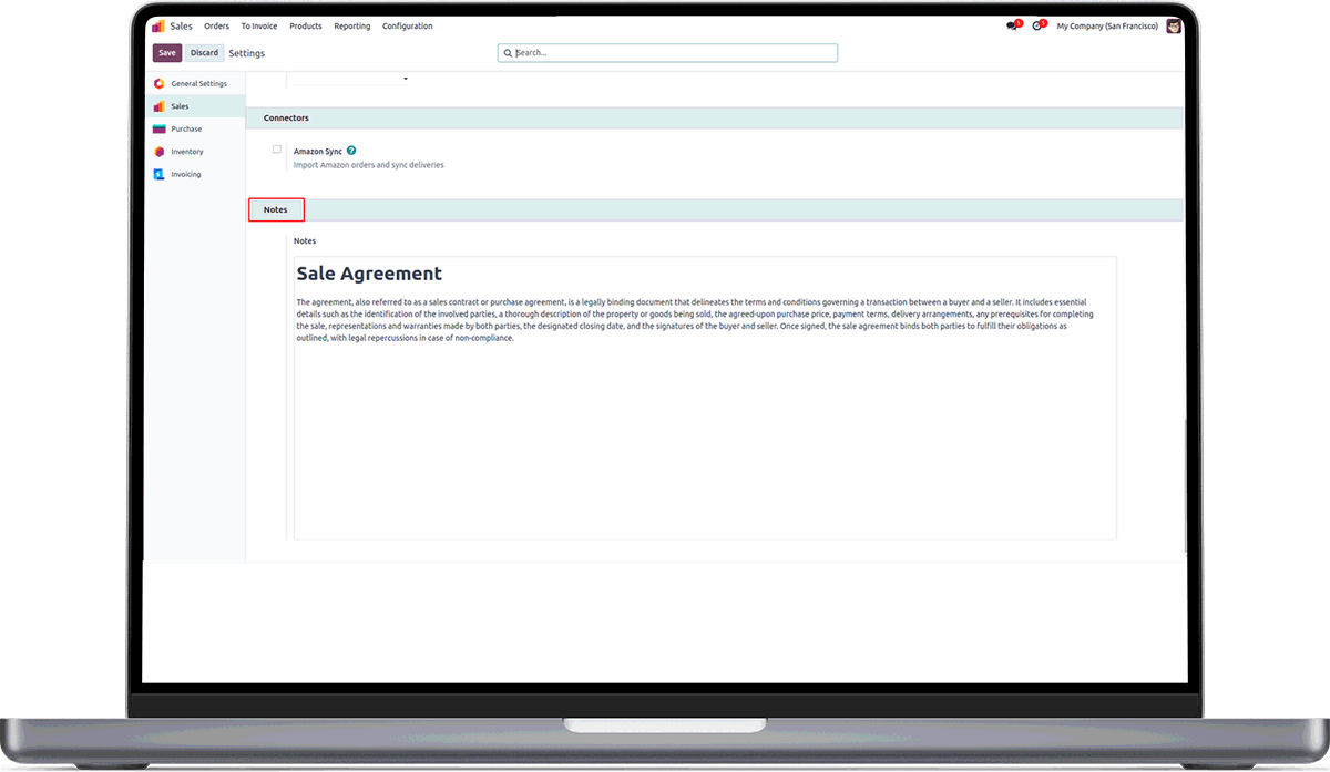 Setup HTML notes in configuration and used this default notes or customized notes in sales,purchase,invoice and inventory form view and also used this notes in reports.