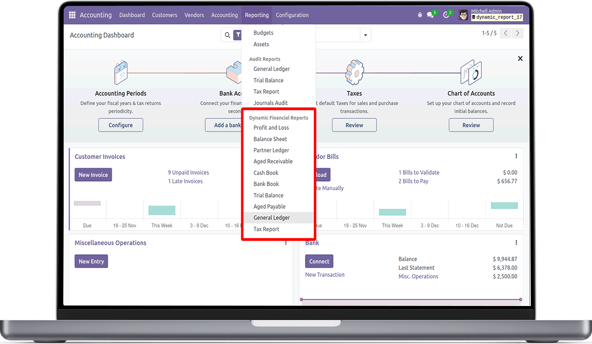 Dynamic Reports for Trial Balance, Profit and Loss, General Ledger, Tax Report, etc.