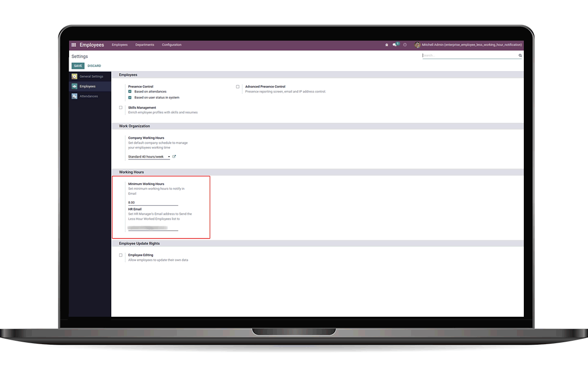 The email body contains the list of less worked employees and the list of employees who forgot to punch out.