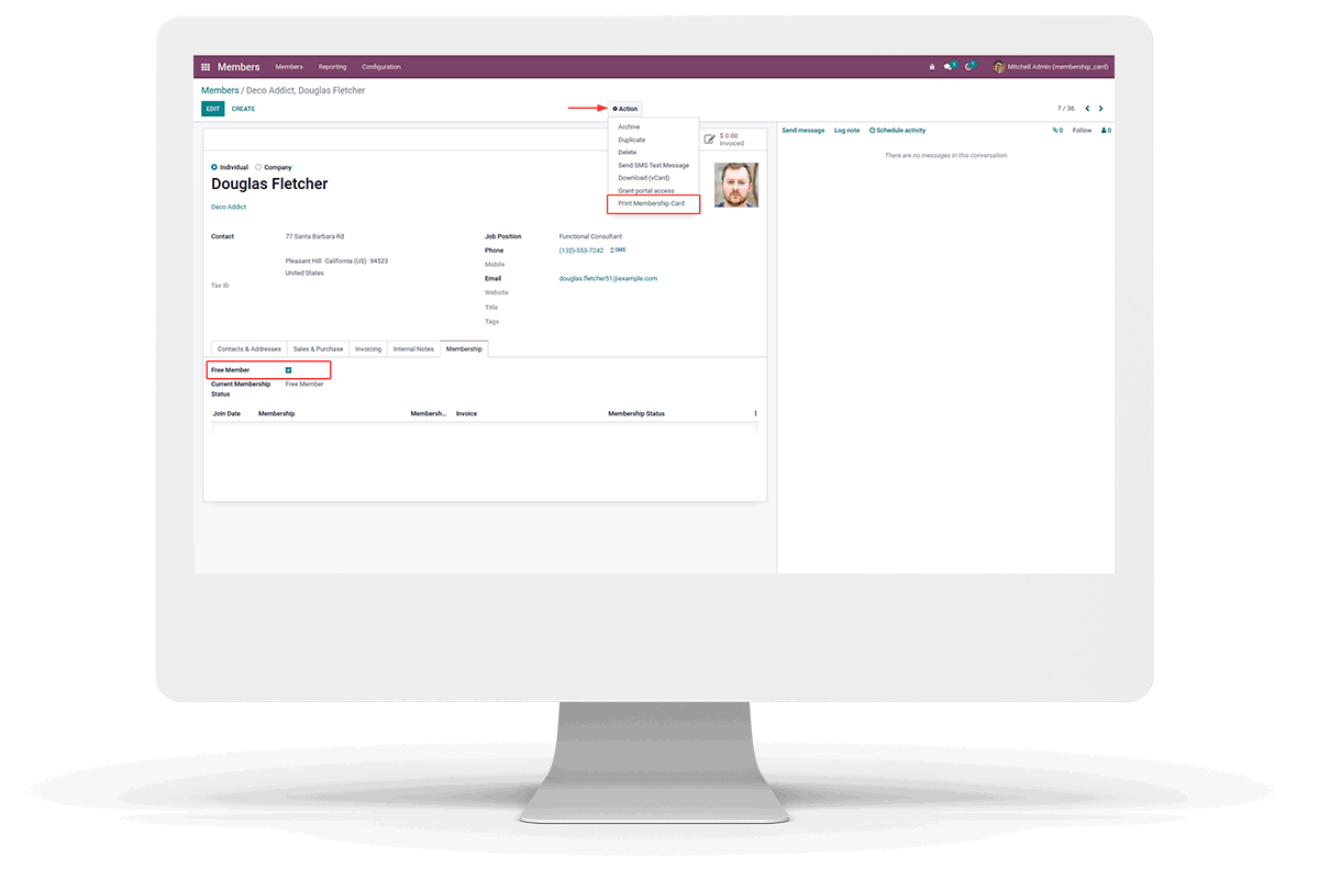 Go to Members Module -> Choose a Member. Based on the condition Free or Paid this will allow you to print Membership Card. If it is Free, Enable Free Member -> Action -> Print Membership Card.