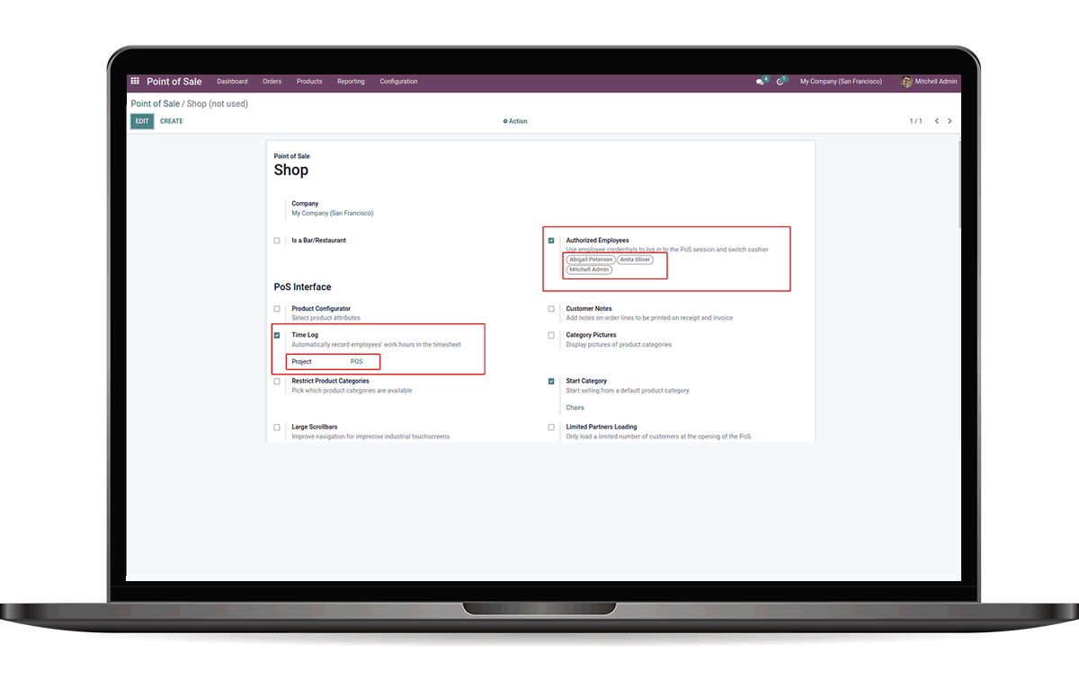 Enable Multi Employee per Session, then the Time Log option will be visible in the Configuration Settings of POS and you can also set a project for the timesheet.