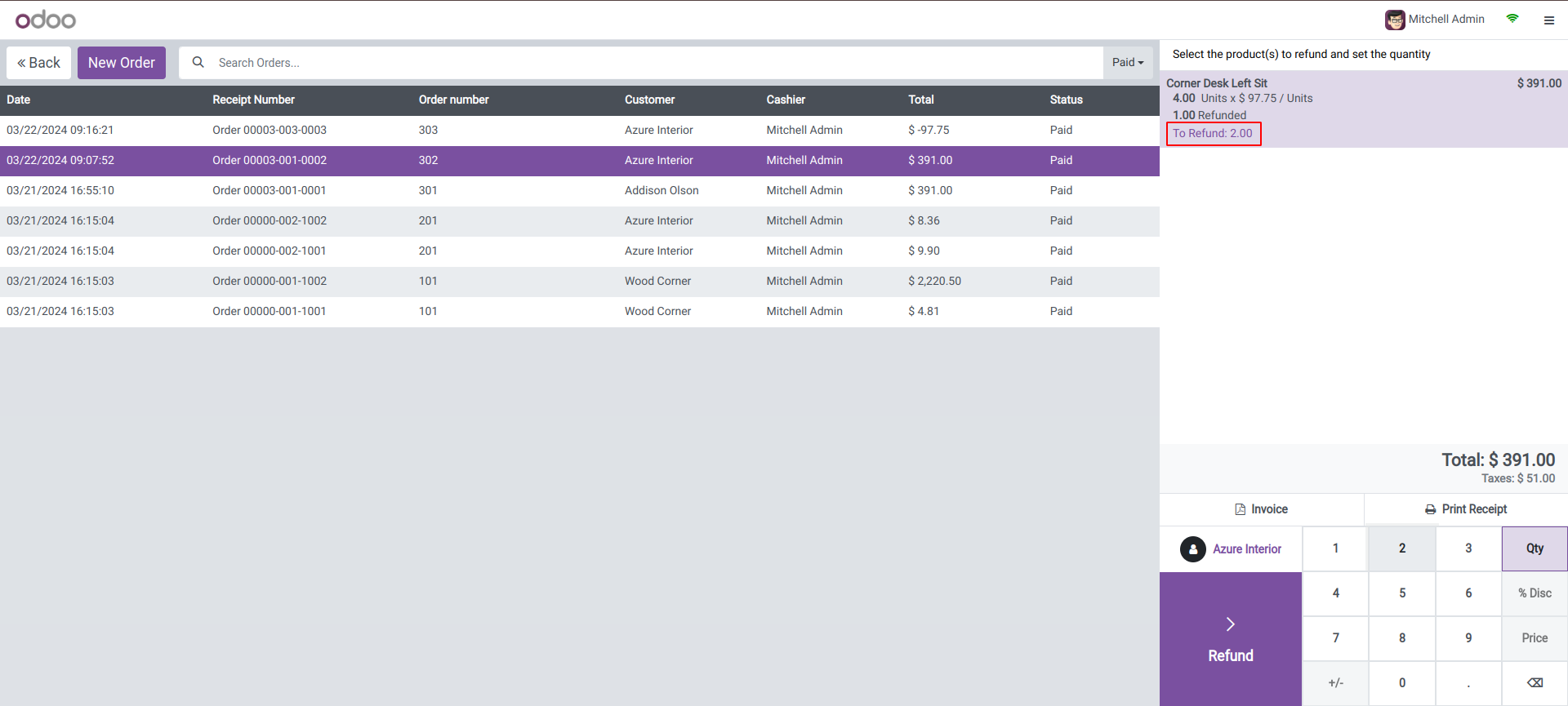 Next, we can process a refund for two quantities and examine how it is reflected in the POS screen, on the receipt, and on the customer's page.