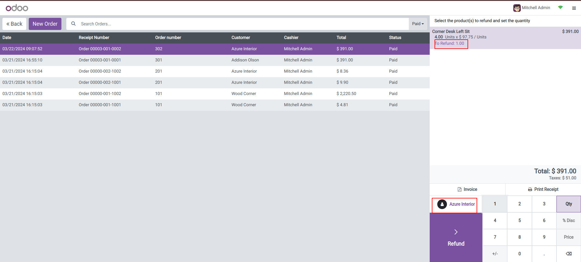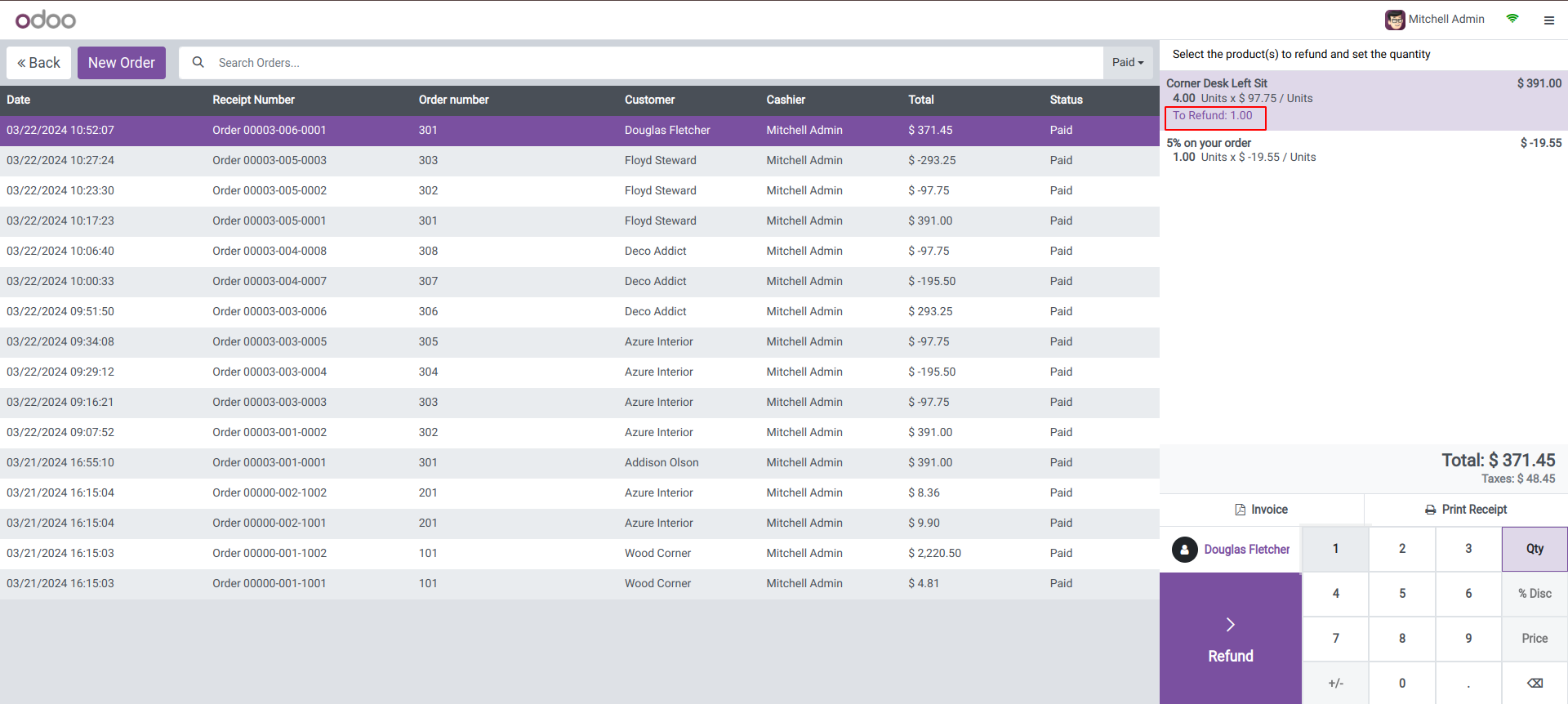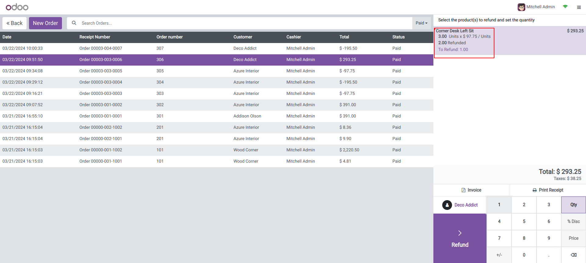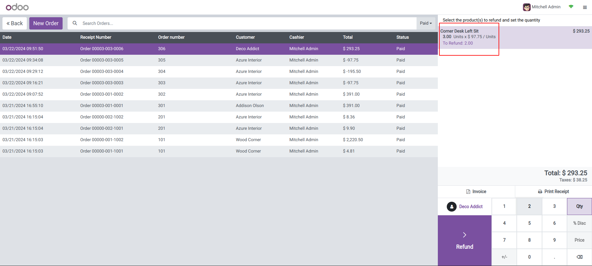 Next, we can process a refund for the final quantity and examine how it is reflected in the POS screen, on the receipt, and on the customer's page.