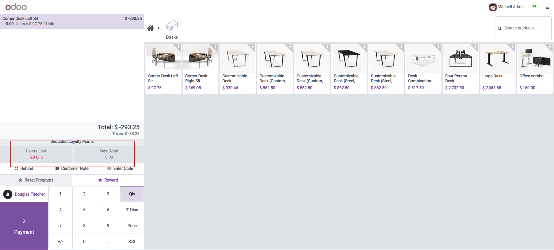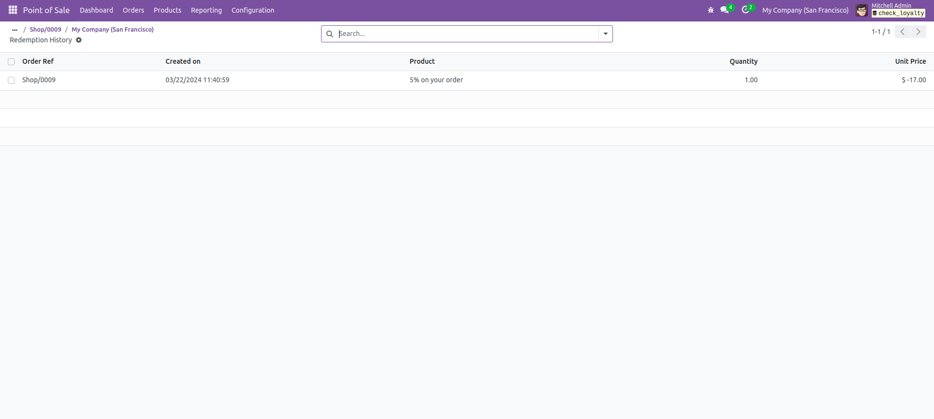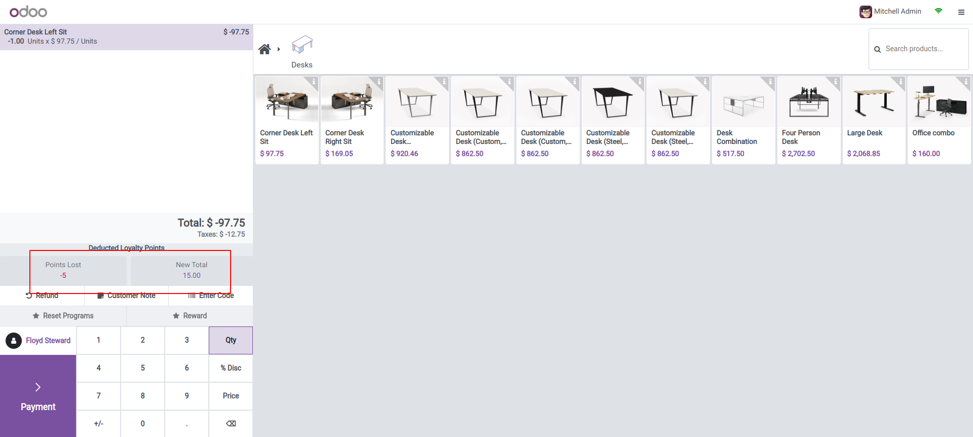 Created a Loyalty program with rule 1 point for per $ spent.We see How it added to order and Pos screen and Receipt . Lets see how it reduced on refund