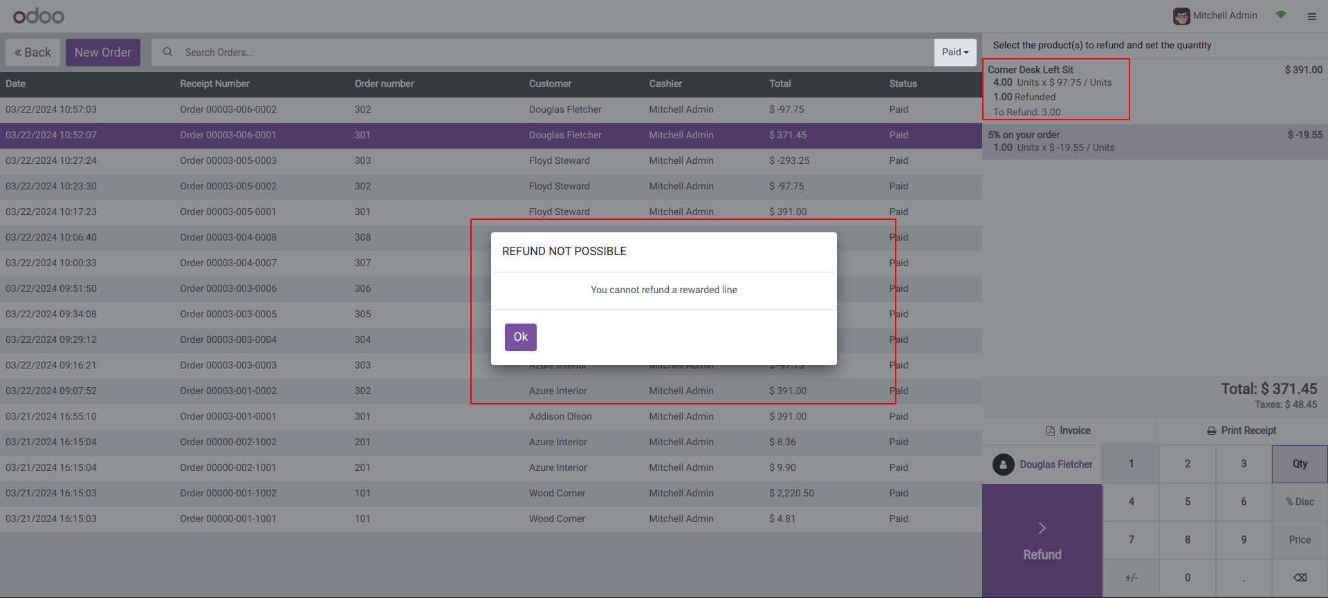 Now we refund the pending quantity, and tried to refund the reward line also, so a warning will appear no refund of reward line is possible because it will conflict the calculation of loyalty points.