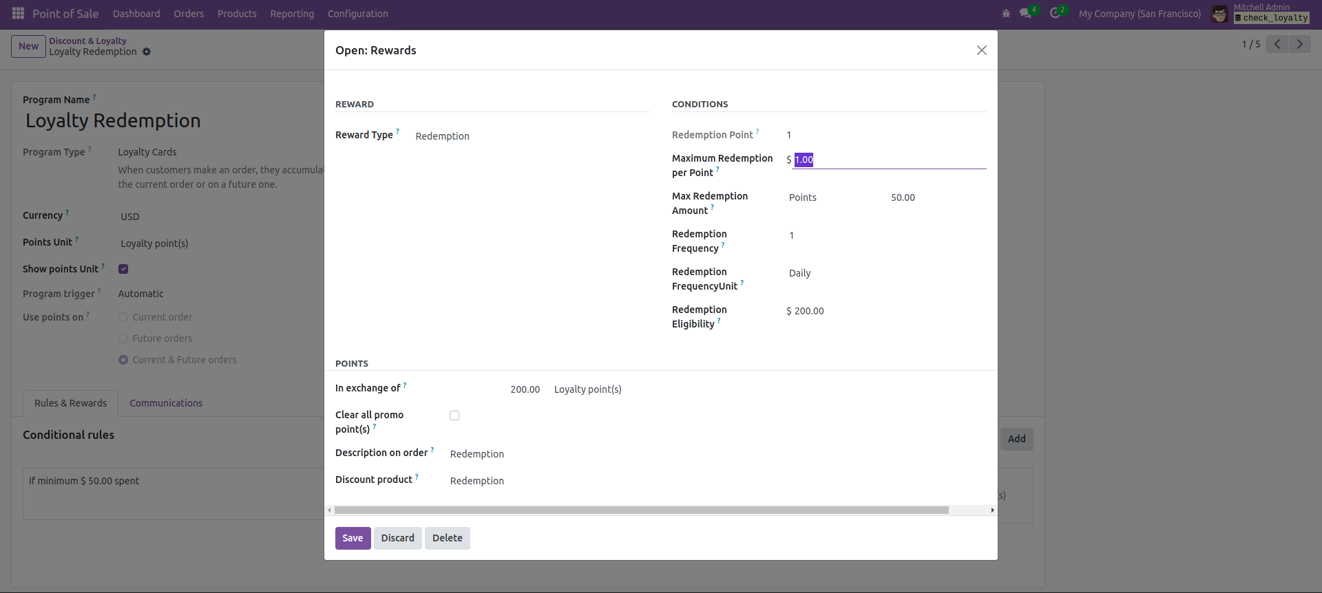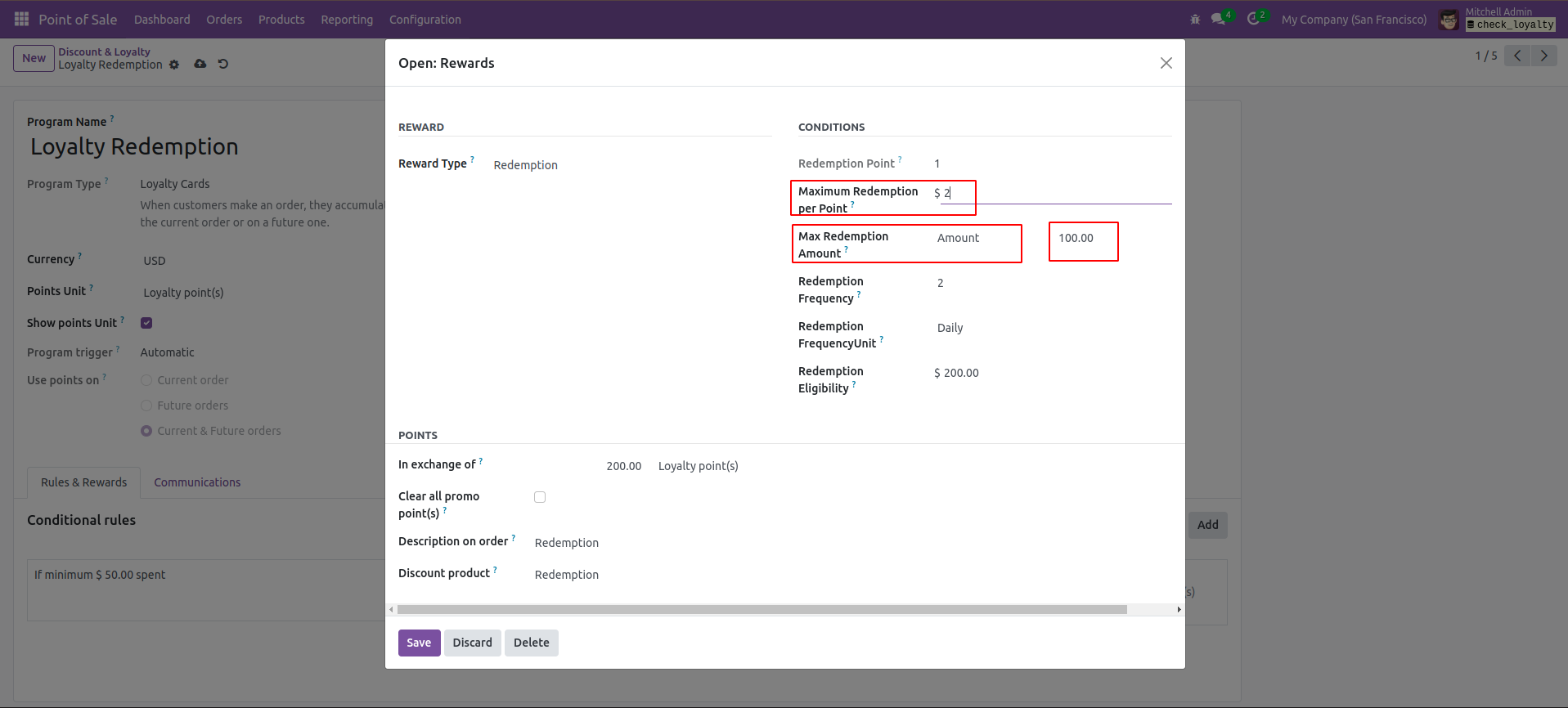 We can set Max redemption amount and how much point per dollar cost ,then in pos we can see the points in popup