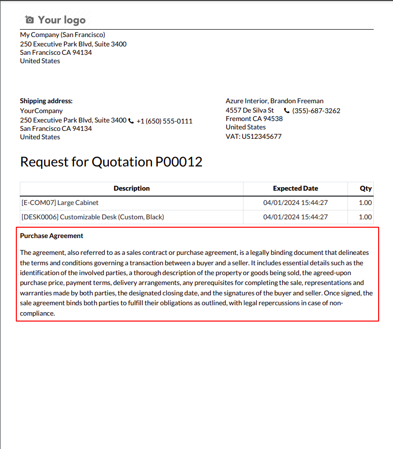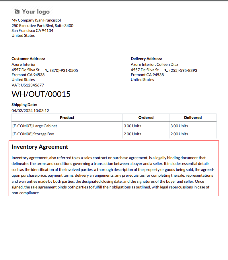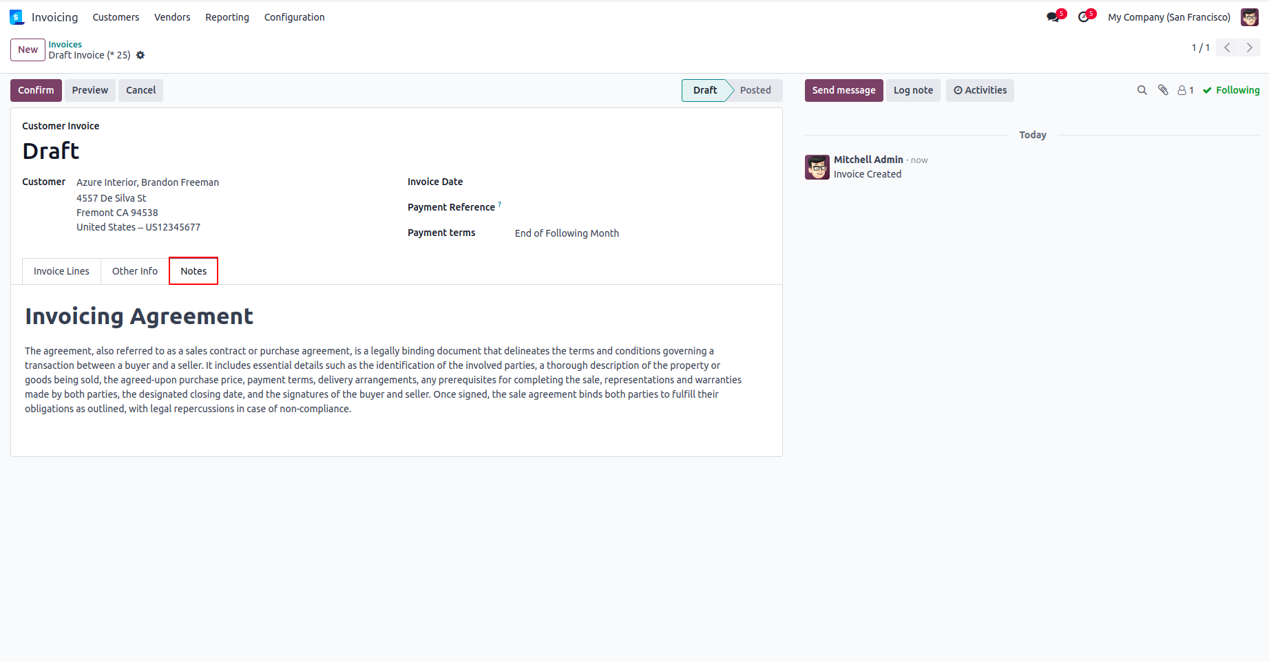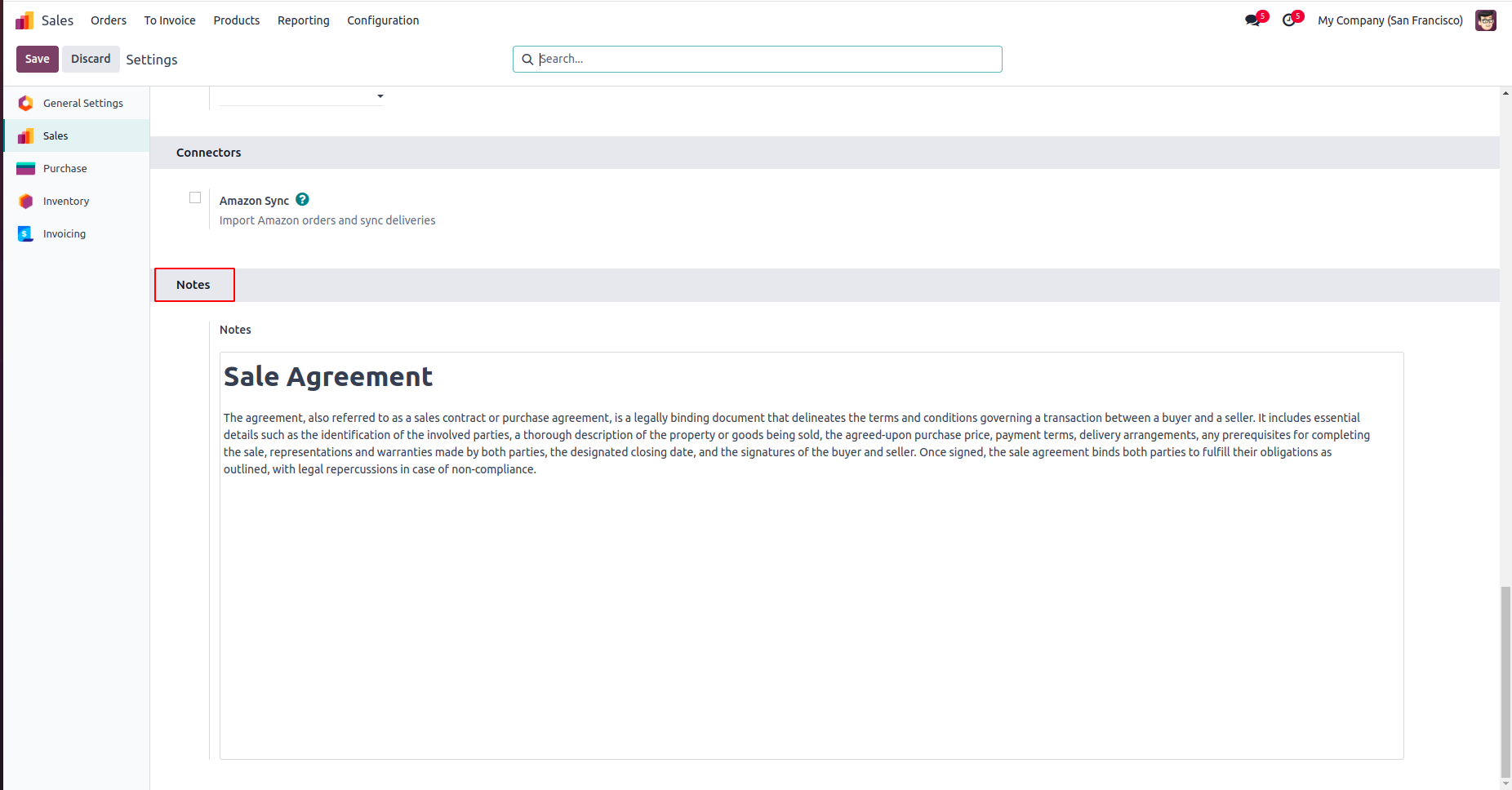Setup HTML notes in configuration and used this default notes or customized notes in sales,purchase,invoice and inventory form view and also used this notes in reports.