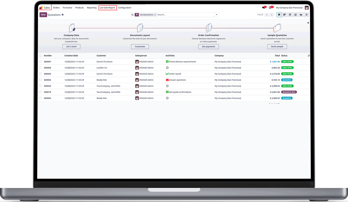 Generate a low sales report per any period you like: for the last 3 months, for a week before New Year, by all historical data, for exactly 327 days. Set a default period and default criteria on the configuration page