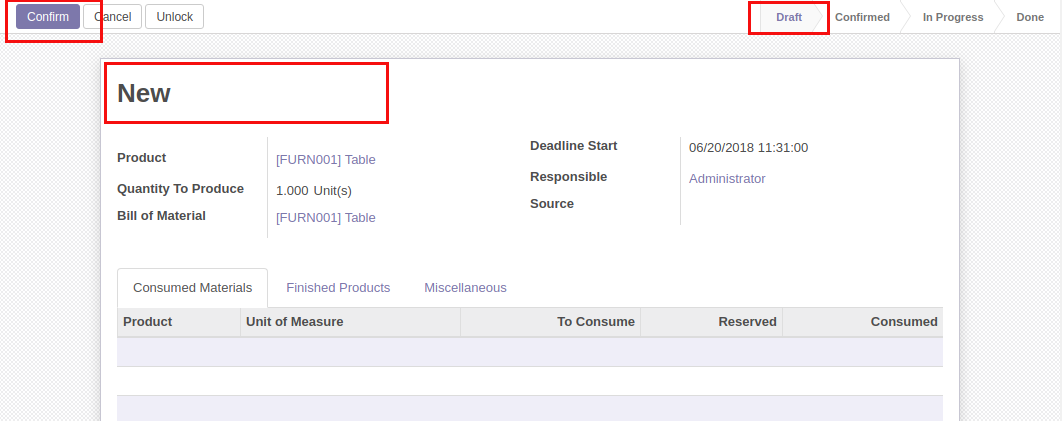 •    A New Button 'Confirm' Is Added To Confirm The Manufacturing Order.
