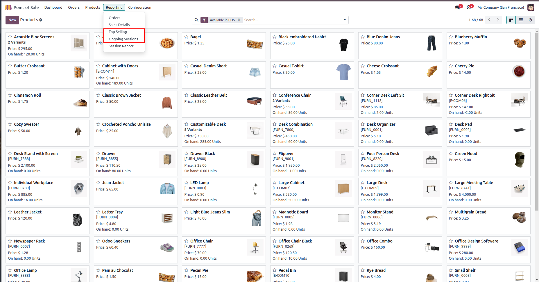 From Point of Sale --> Reporting, user can access the custom Reports like Top Selling and Ongoing Sessions.