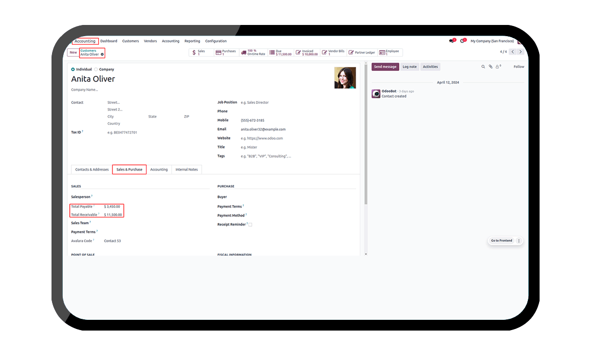Screenshot of the partner form is shown above. The fields 'Total Payable' and 'Total Receivable' is inside the Sales & Purchase tab under the section Sales