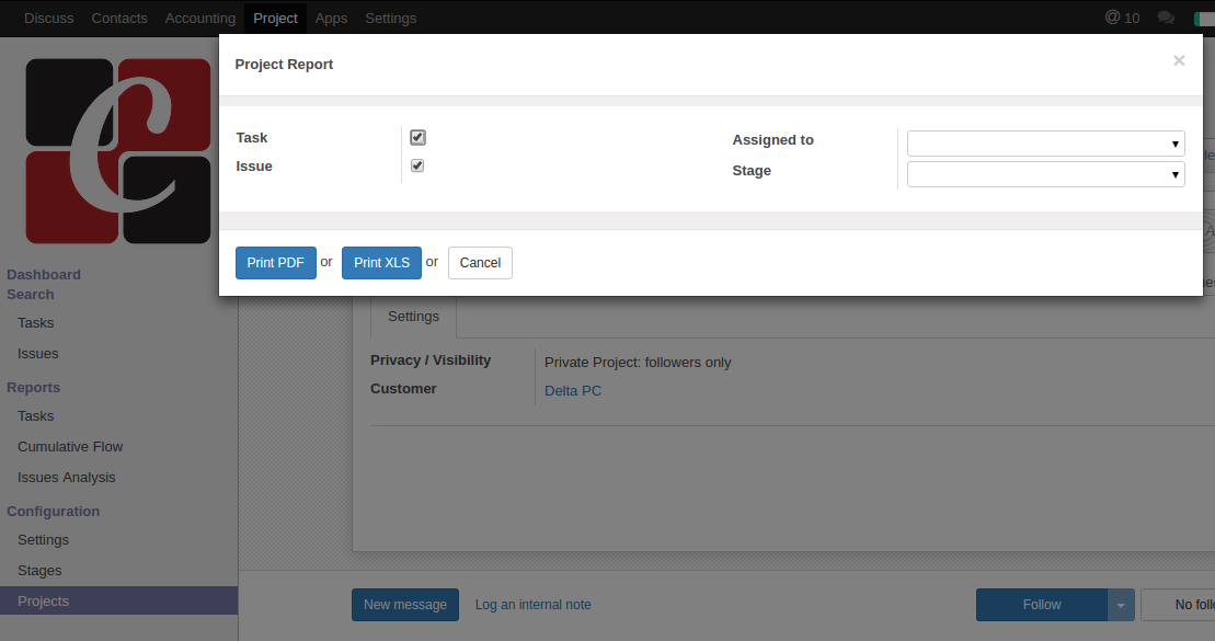 Then a wizard will open. You can filter the project report by selecting the Appropriate options from the wizard. if you don't select "Assigned to" & "Stage" in the wizard, then system automatically select all the users and stages.