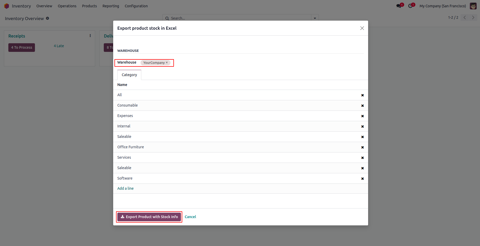 Navigate to the following steps: Reporting -> Current Stock in Excel.