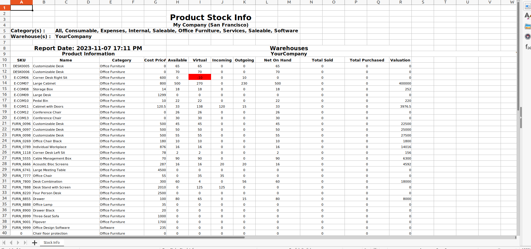 When you click on 'Export Product with Stock Info,' an XLS report is generated as follows.