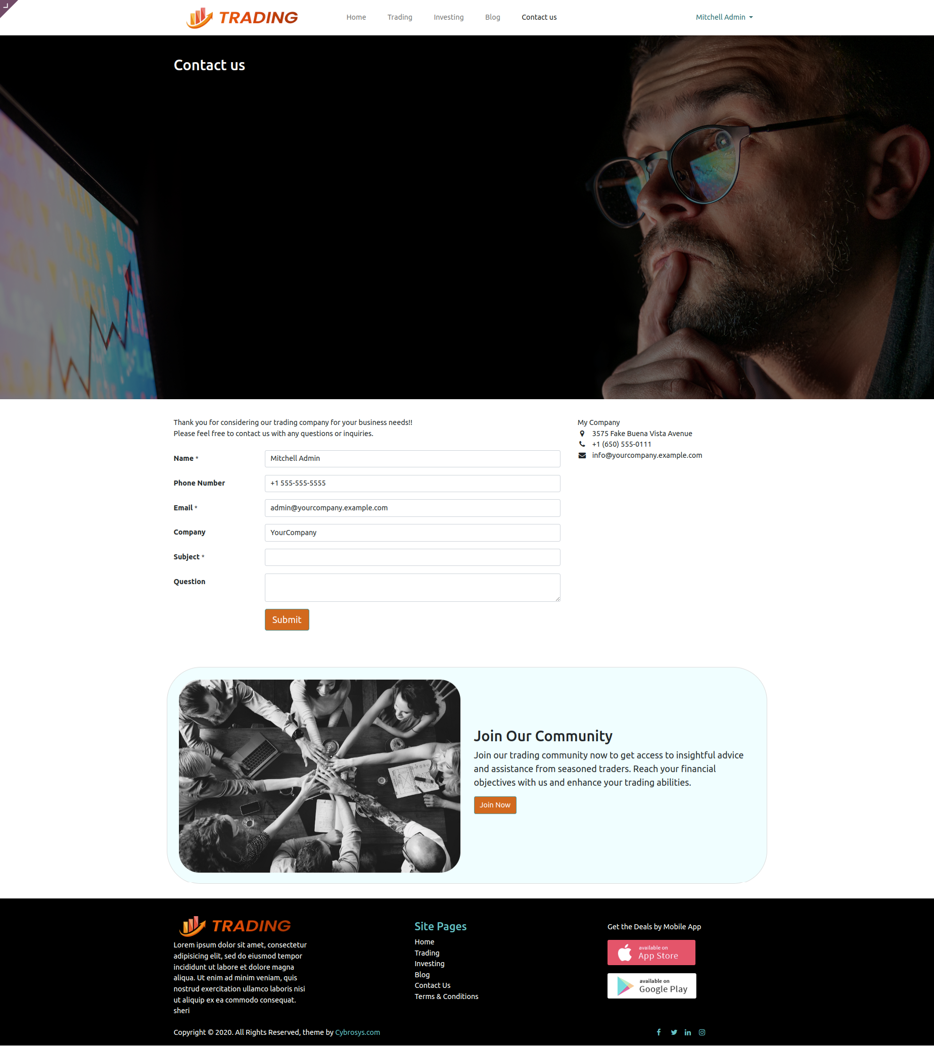 Theme Trading is a simple and elegant theme for your odoo trading website. It is easy to customize and use. It comes with customizable snippets that can be dragged and dropped to make attractive webpages. Simple and stylish header, footer and page banners.