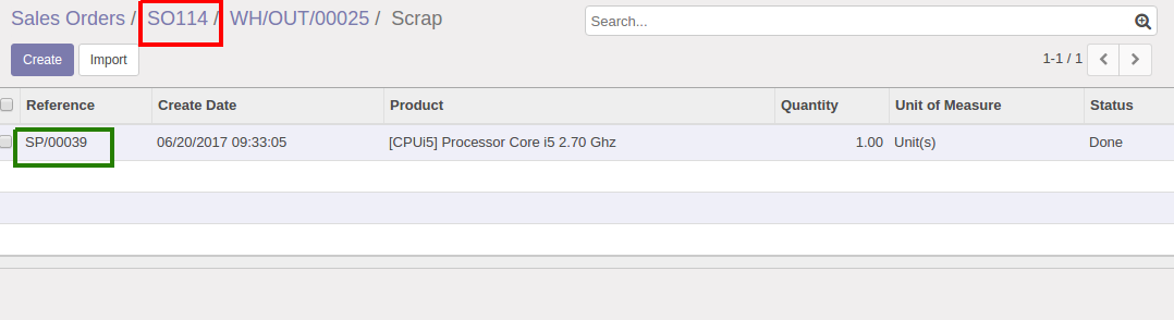 Here we generated a scrap product from the sale order 'SO114'. In inventory, 'Related Source Document' automatically gets the value of this sale order.