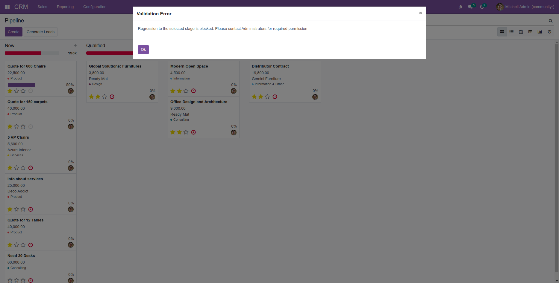 If the user tries to regress the opportunity to the specified stage, warning will be displayed
