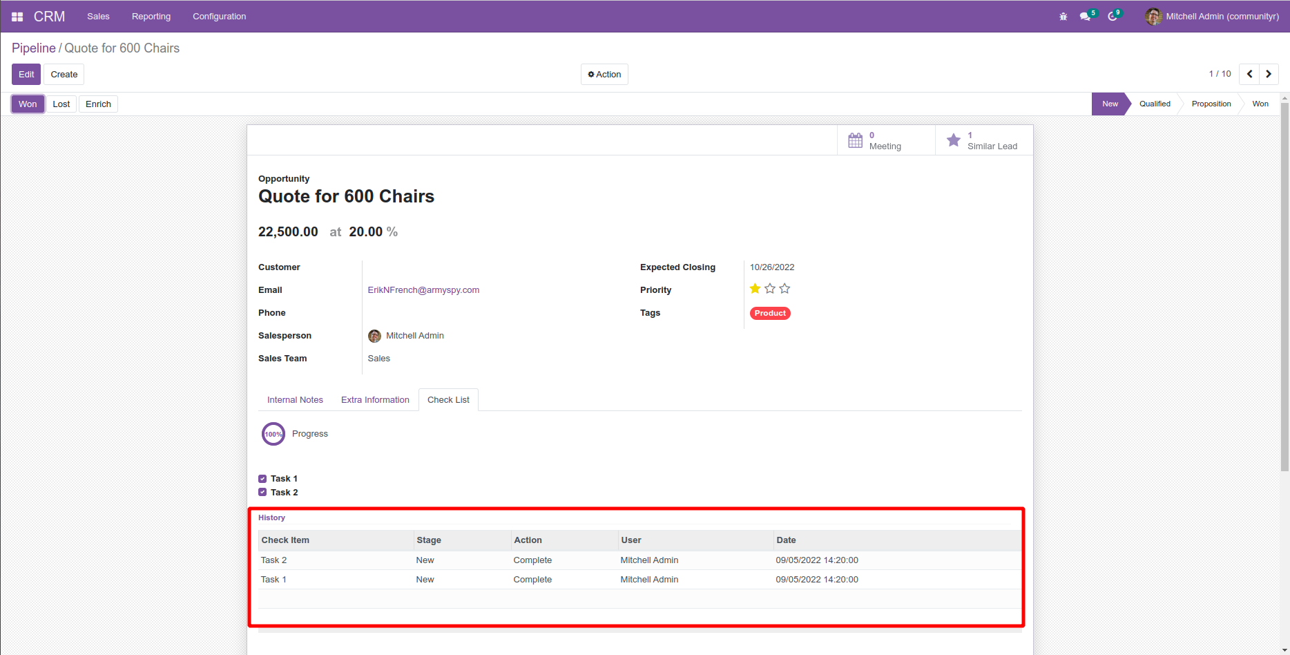 Check list completed progress can be viewed in the checklist section of each opportunity.