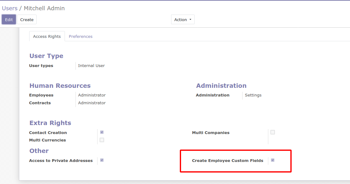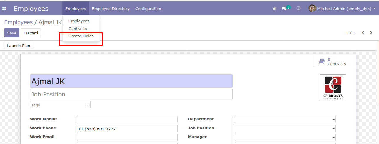 Employee Dynamic Fields module helps with easy creation of custom fields in employee without any coding. This module helps to add new fields on the employee form as per one's requirement. From the Employee menu, one can click create fields and can create a new custom field without any coding.
