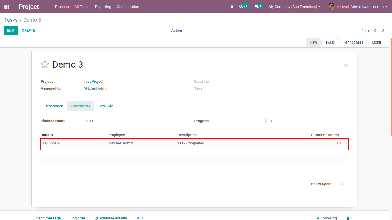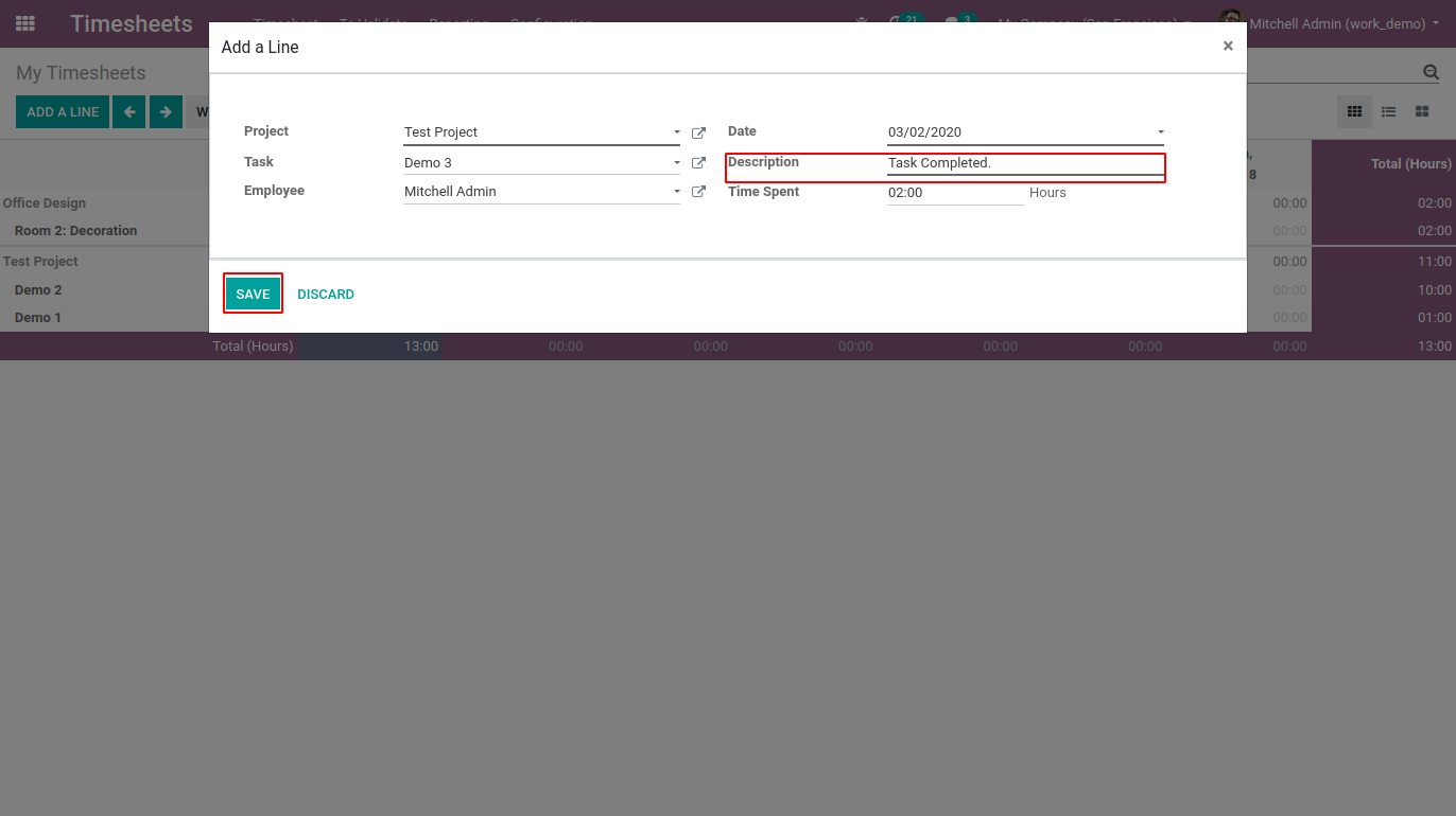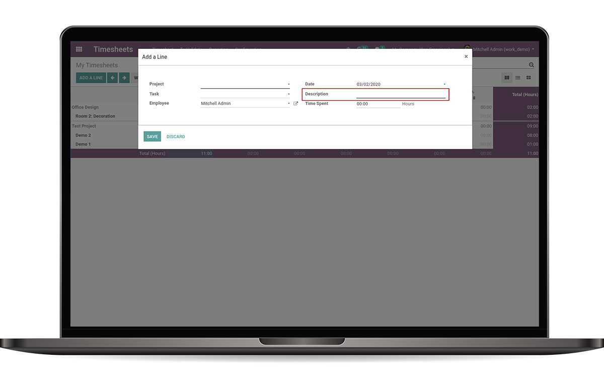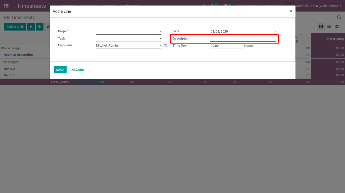 In Timesheets module we can add timesheet for the tasks like below. In here we can see a new field for adding description of the current task.