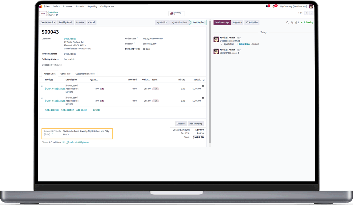 Sale order form showing total amount in words