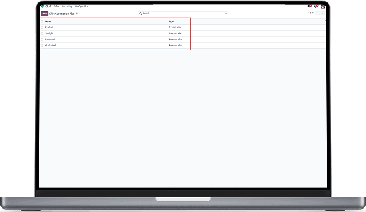 The Commission Plan window can be accessed from the Configuration menu of the module and select the Commission Plan menu. Here all the Commission Plan details of the operation in respect to the functioning of the Odoo CRM will be depicted.
