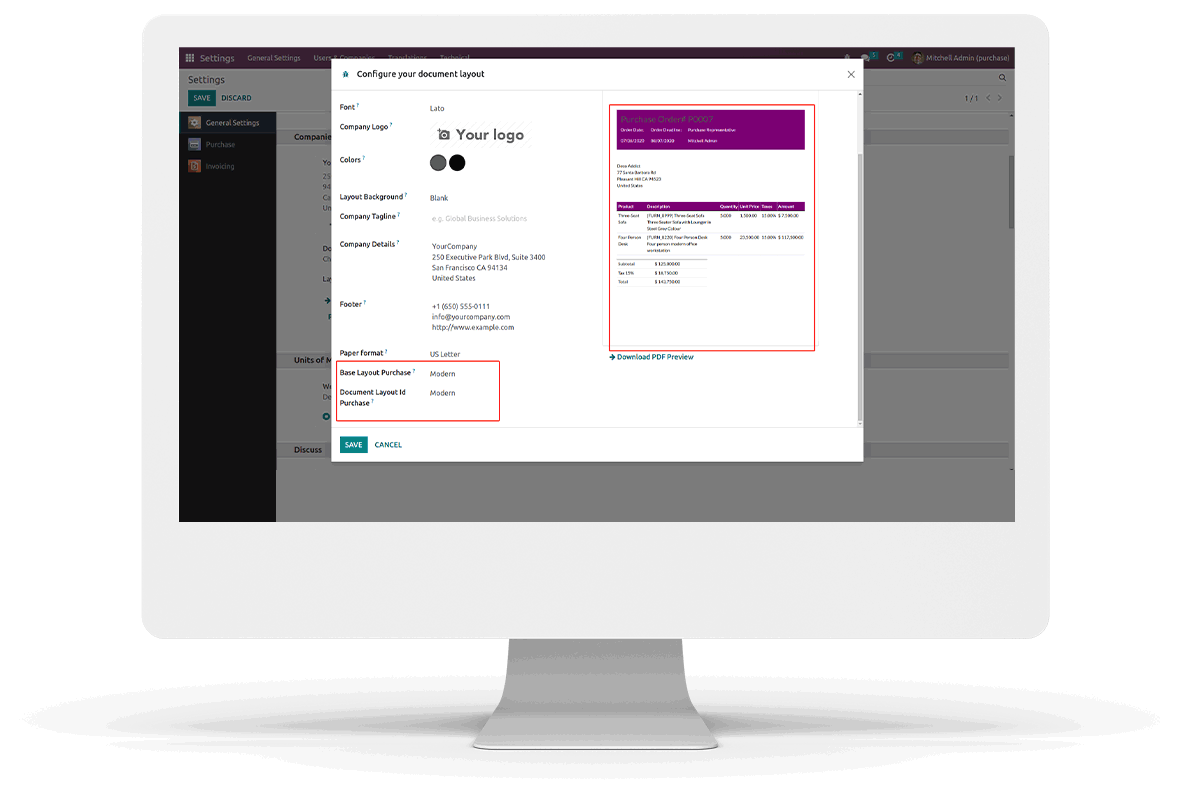 From Document Layout Configuration, user can select and configure the Purchase Document Layout