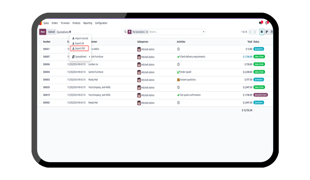 Go to the list view, click the Settings button, and select "Export to PDF" to generate the PDF.