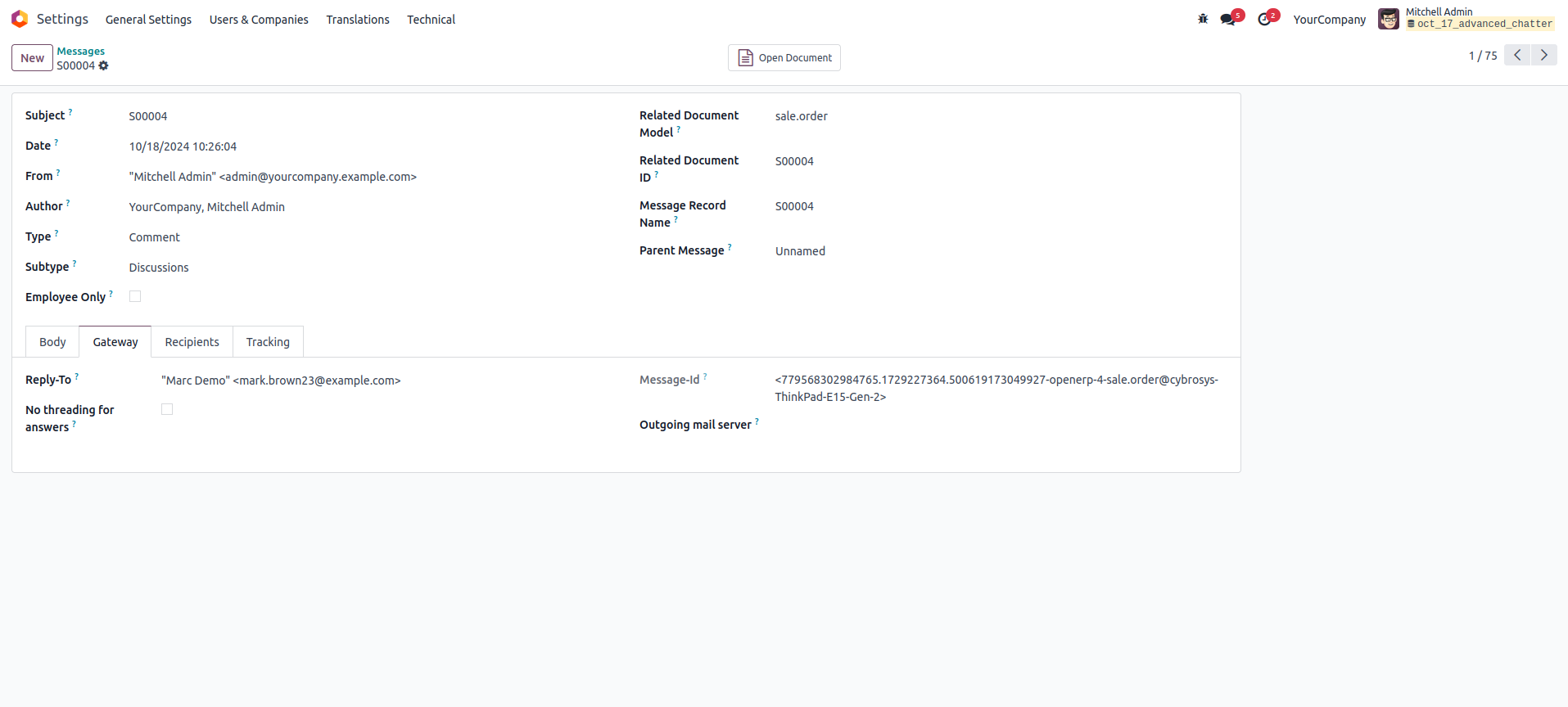 Go to Settings -> Technical -> Messages. Here, you can view the messages you have sent. In the reply-to options, you will see the user we specified.