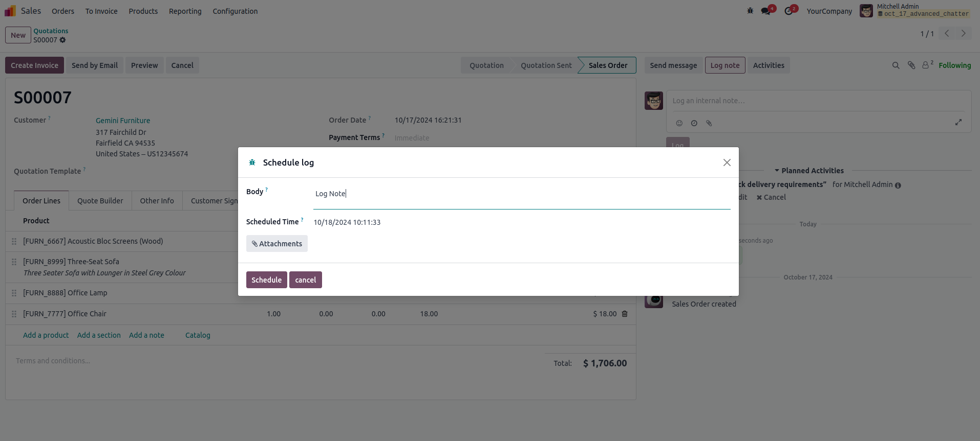 Clicking the icon within the log note opens a wizard, facilitating the scheduling of the log note.