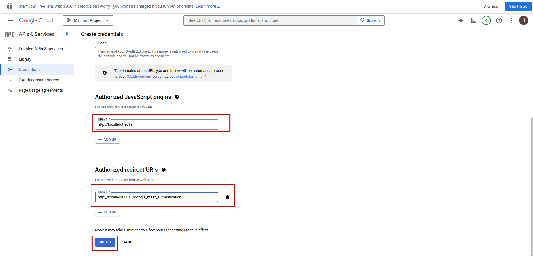 9. In the Authorized JavaScript Origins section, add your company's URL. And in the Authorized redirect URIs section, add your companys URL followed by /google_meet_authentication.